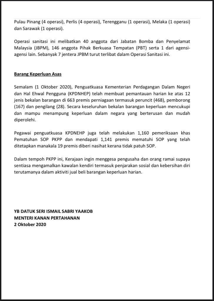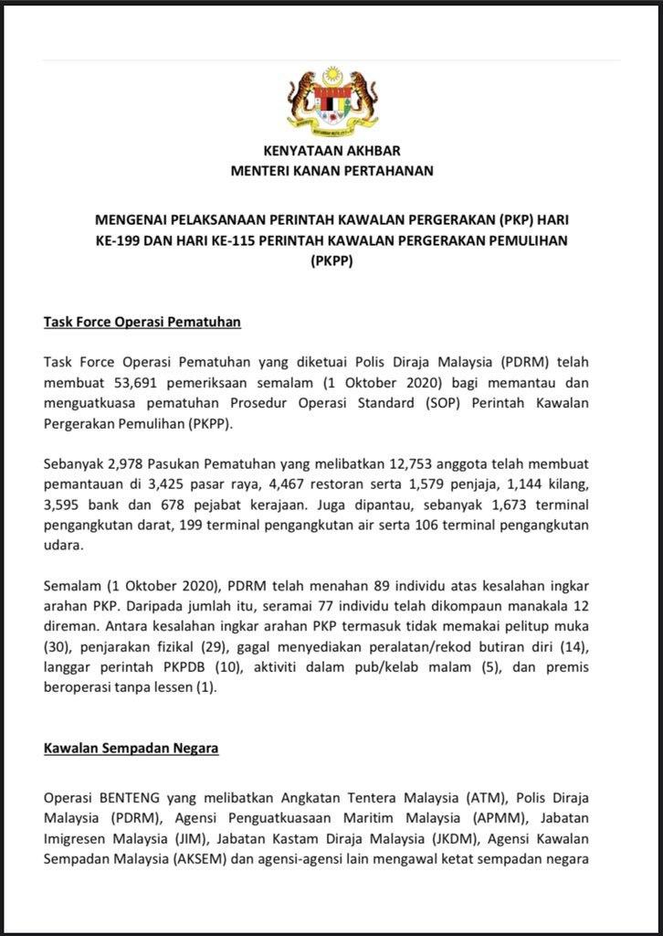 Kenyataan Akhbar Menteri Kanan Pertahanan 02/10/2020 0200 PM Aiman Siaran Media 02 October 2020 Hits: 711 Rating: ( 0 Rating ) Please Rate Vote 1 Vote 2 Vote 3 Vote 4 Vote 5 /bencana2/images/ndcc/documents/covid19/siaranmedia202010/SIARAN_MEDIA_KKM_20201002_07.pdf Facebook Twitter Prev Next
