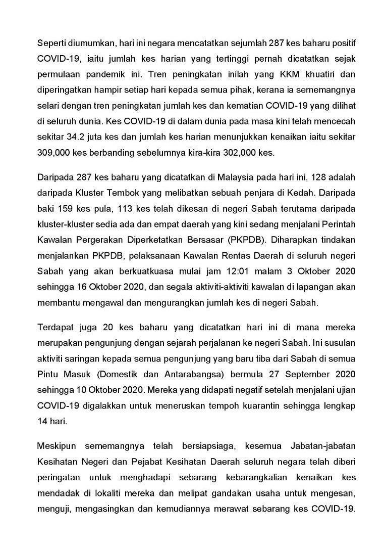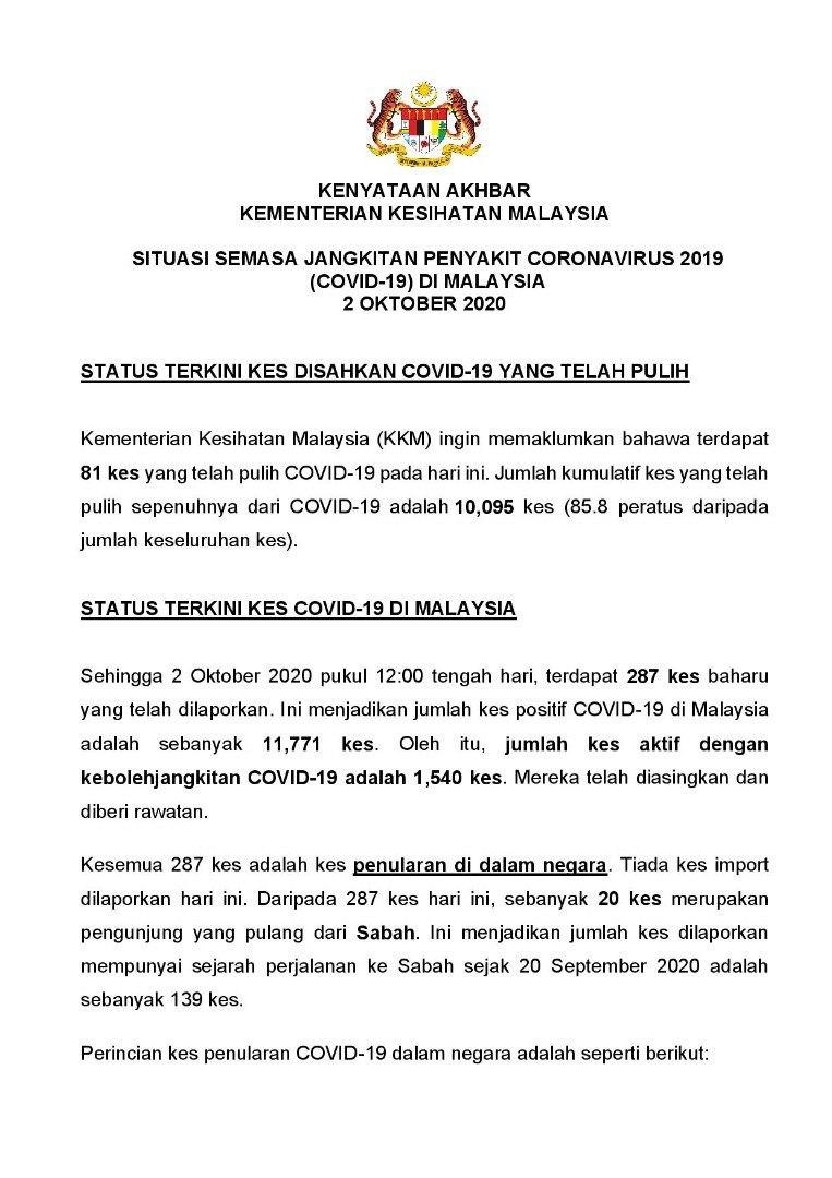 Kenyataan Akhbar KP KKM 02/10/2020 0500 PM Asrul Siaran Media 02 October 2020 Hits: 907 Rating: ( 0 Rating ) Please Rate Vote 1 Vote 2 Vote 3 Vote 4 Vote 5 Facebook Twitter Prev Next
