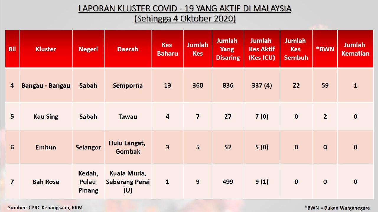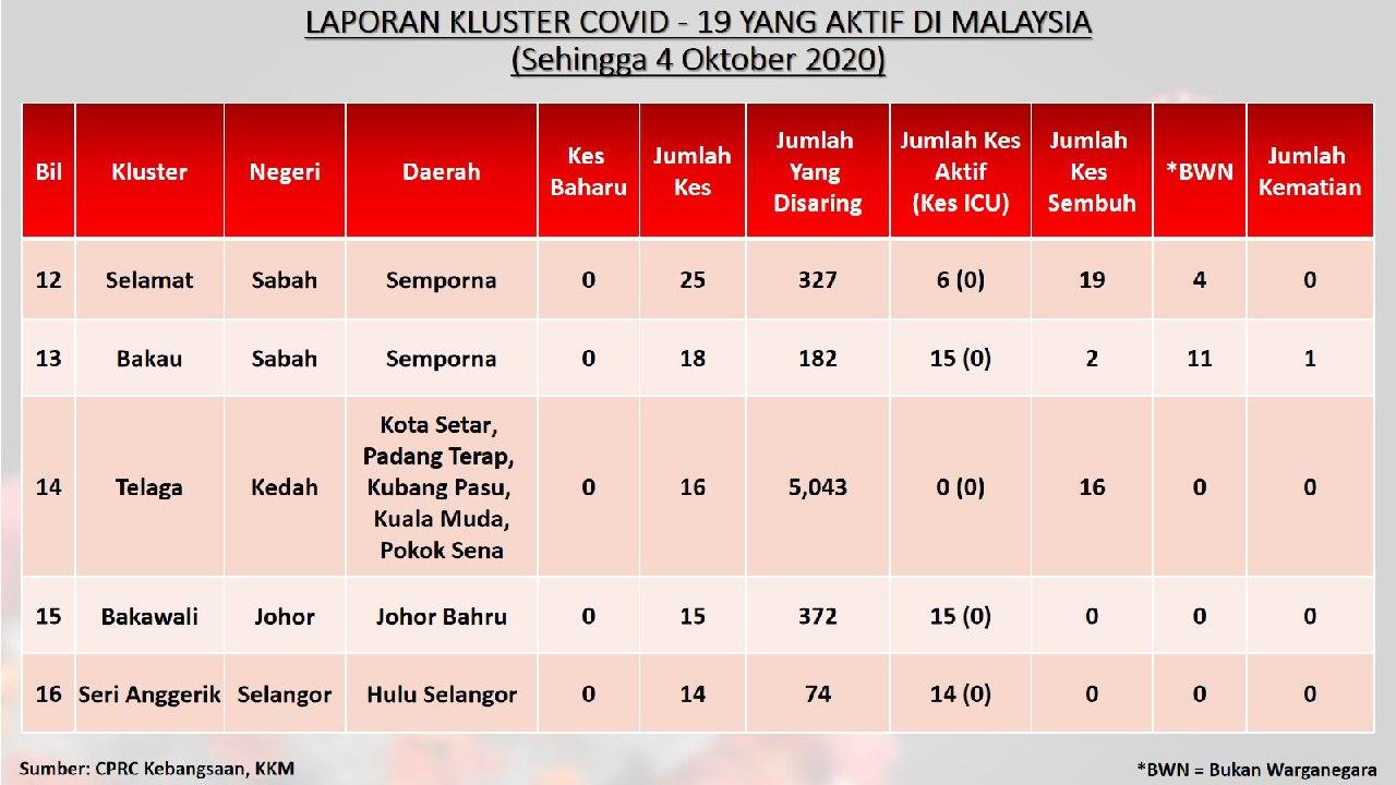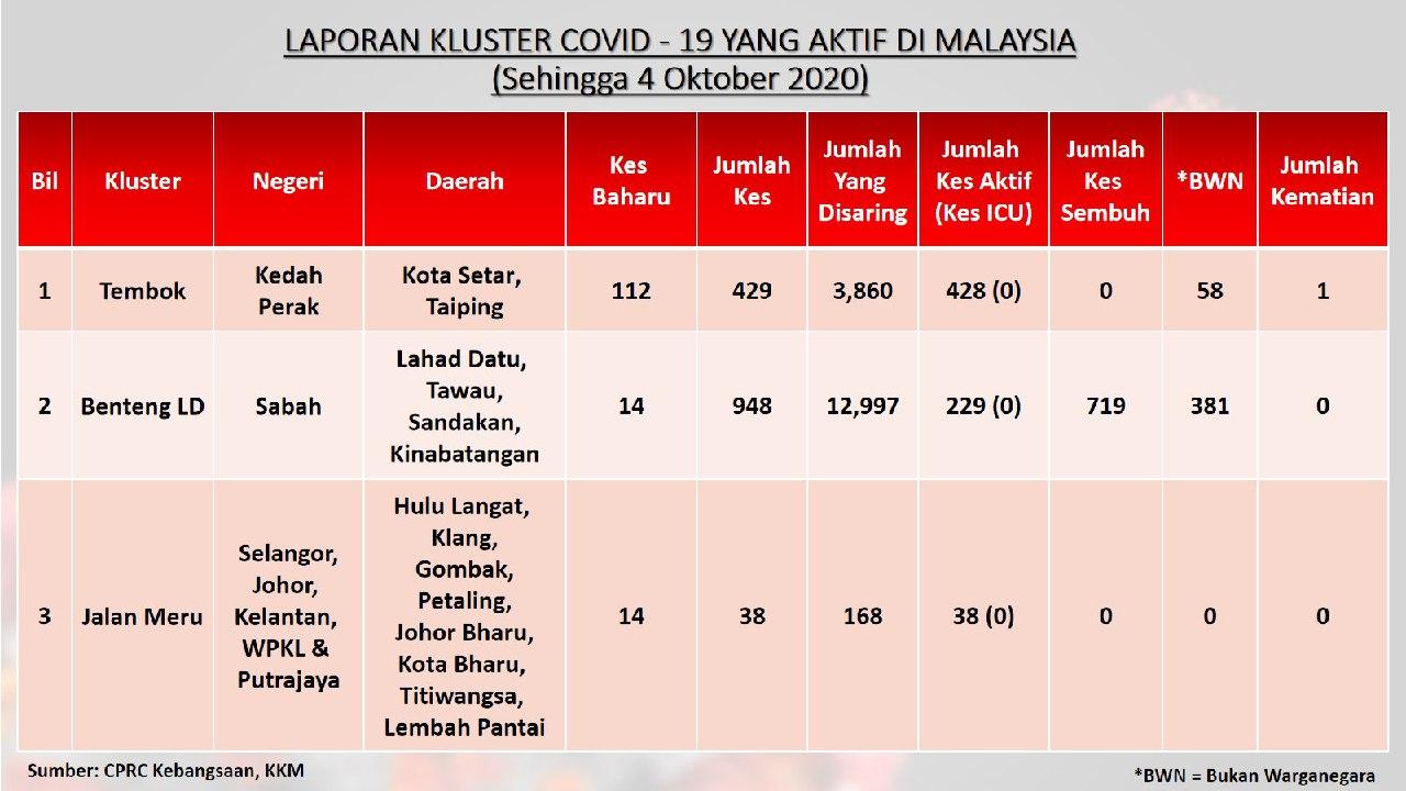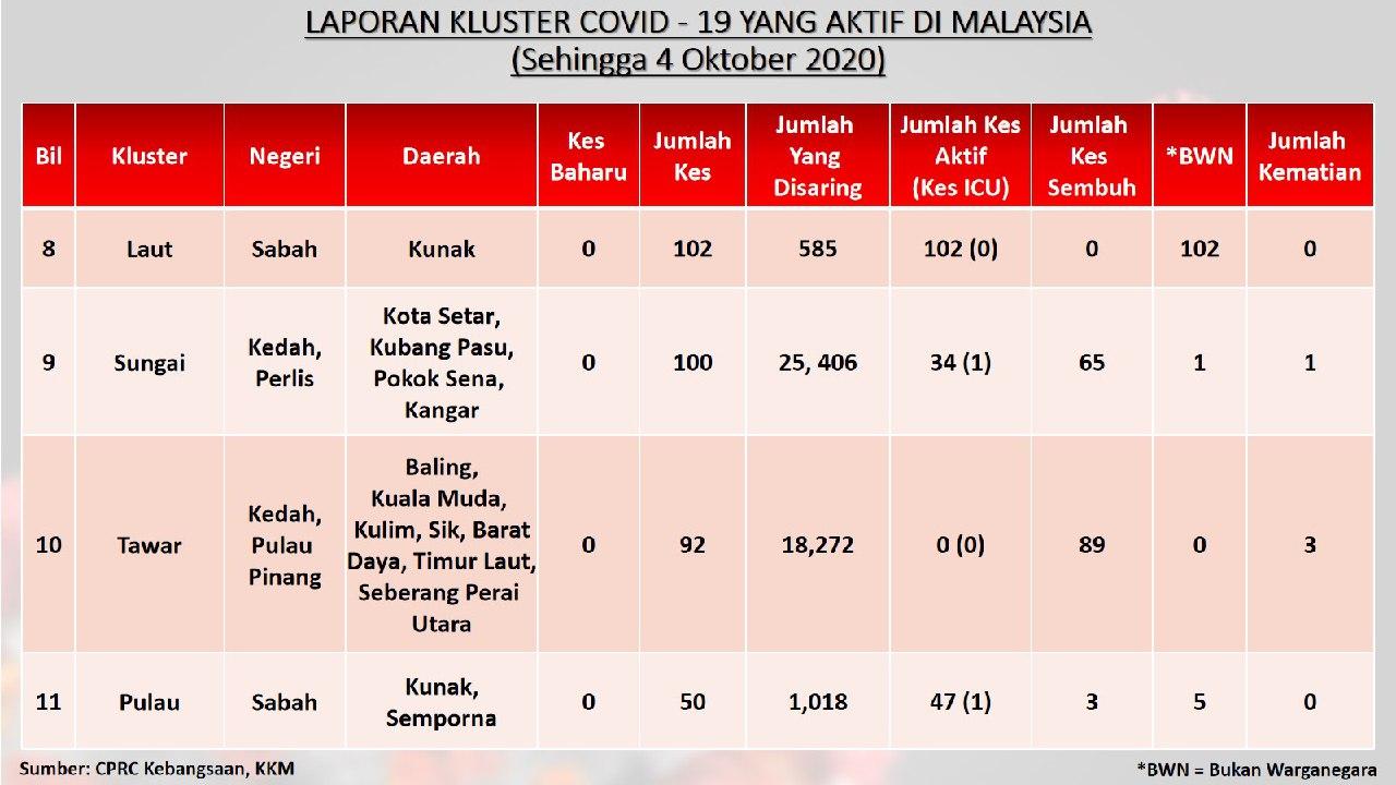 Laporan Kluster COVID-19 Aktif Di Malaysia 04/10/2020 Aiman Siaran Media 04 October 2020 Hits: 789 Rating: ( 0 Rating ) Please Rate Vote 1 Vote 2 Vote 3 Vote 4 Vote 5 Facebook Twitter Prev Next