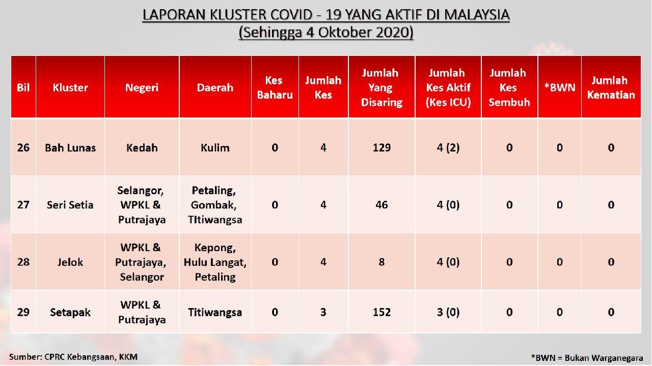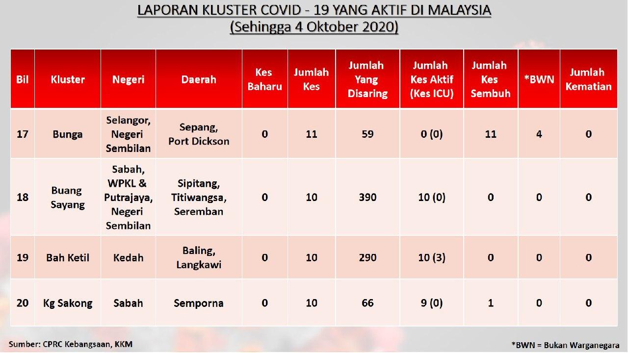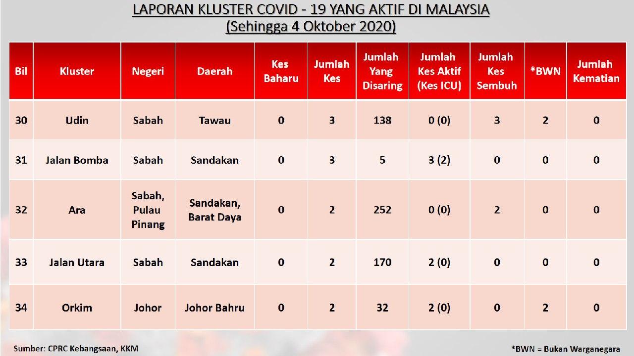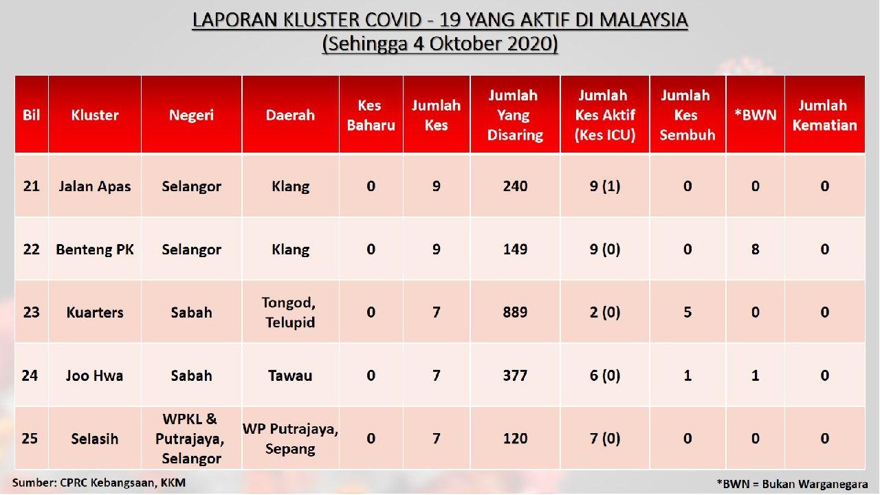 Laporan Kluster COVID-19 Aktif Di Malaysia 04/10/2020 Aiman Siaran Media 04 October 2020 Hits: 789 Rating: ( 0 Rating ) Please Rate Vote 1 Vote 2 Vote 3 Vote 4 Vote 5 Facebook Twitter Prev Next