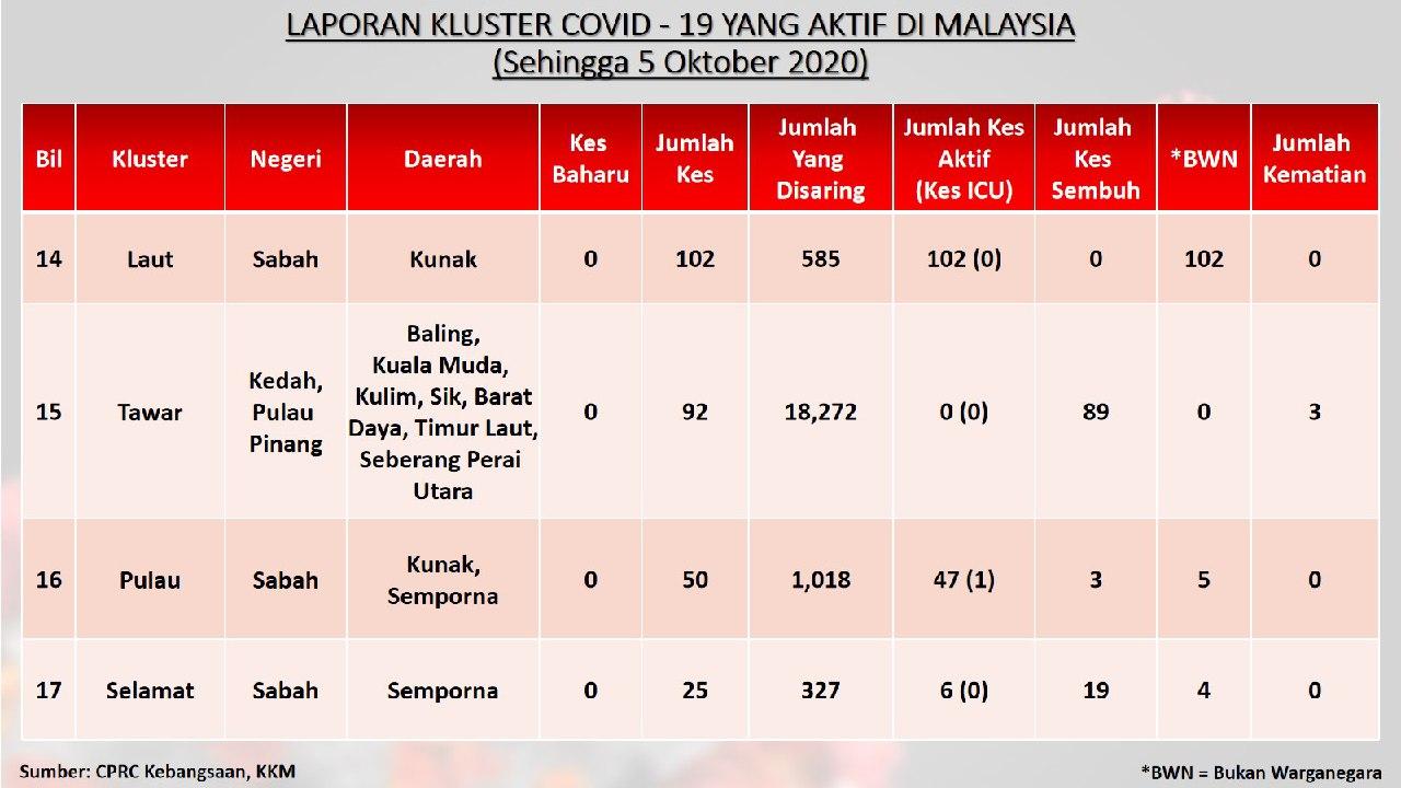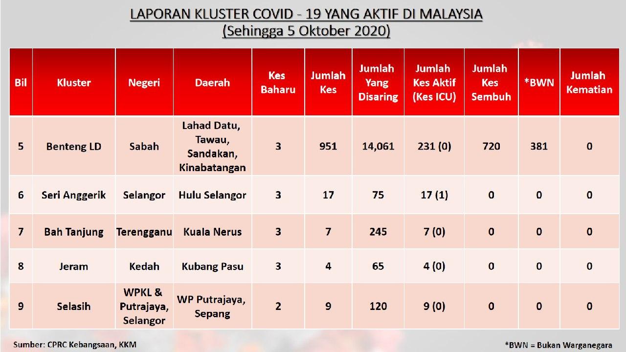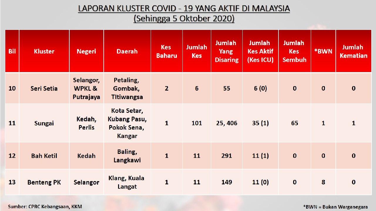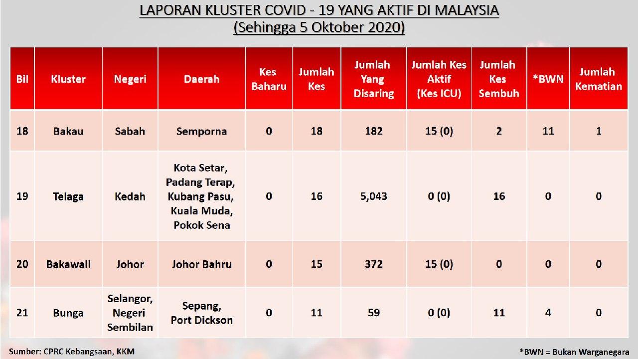 Laporan Kluster COVID-19 Aktif Di Malaysia 05/10/2020 Aiman Siaran Media 05 October 2020 Hits: 958 Rating: ( 0 Rating ) Please Rate Vote 1 Vote 2 Vote 3 Vote 4 Vote 5 Facebook Twitter Prev Next