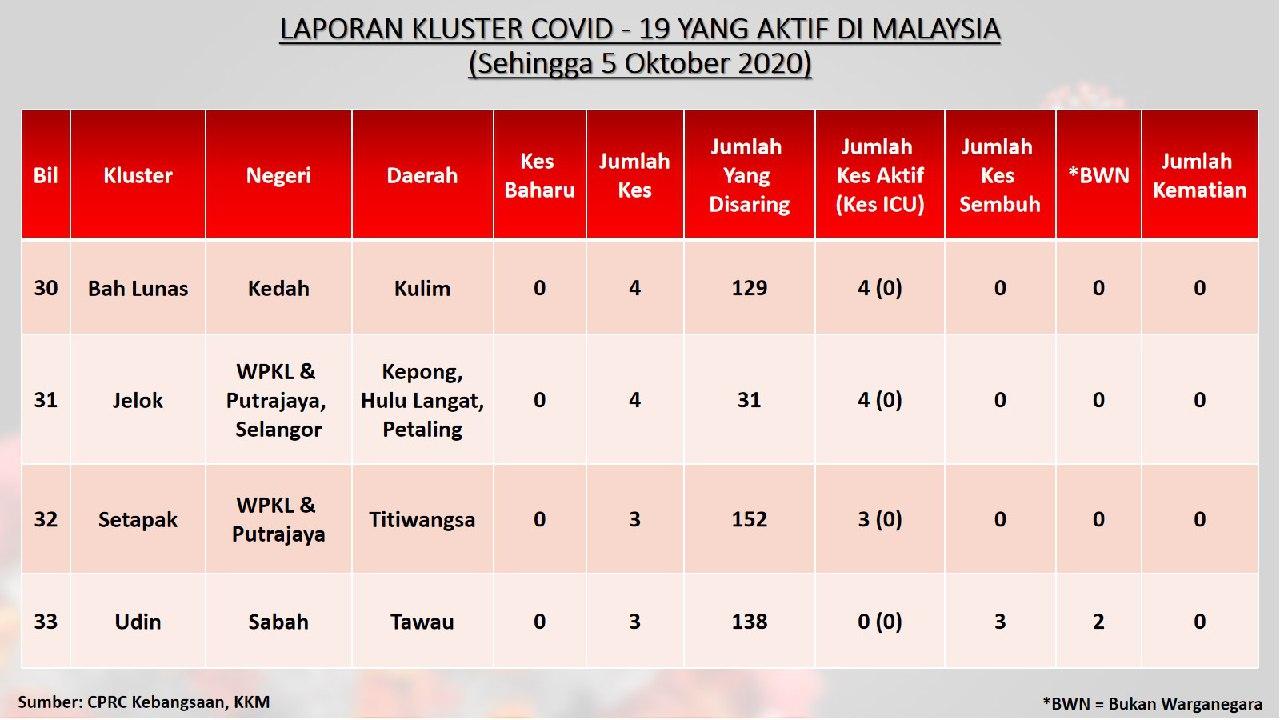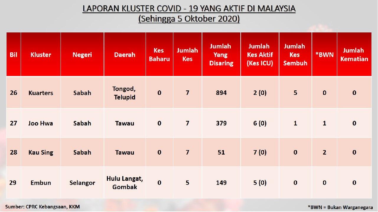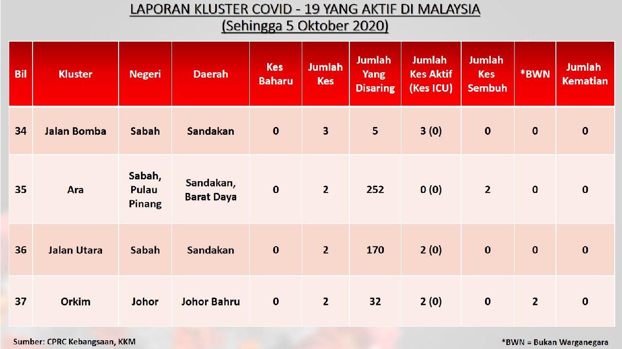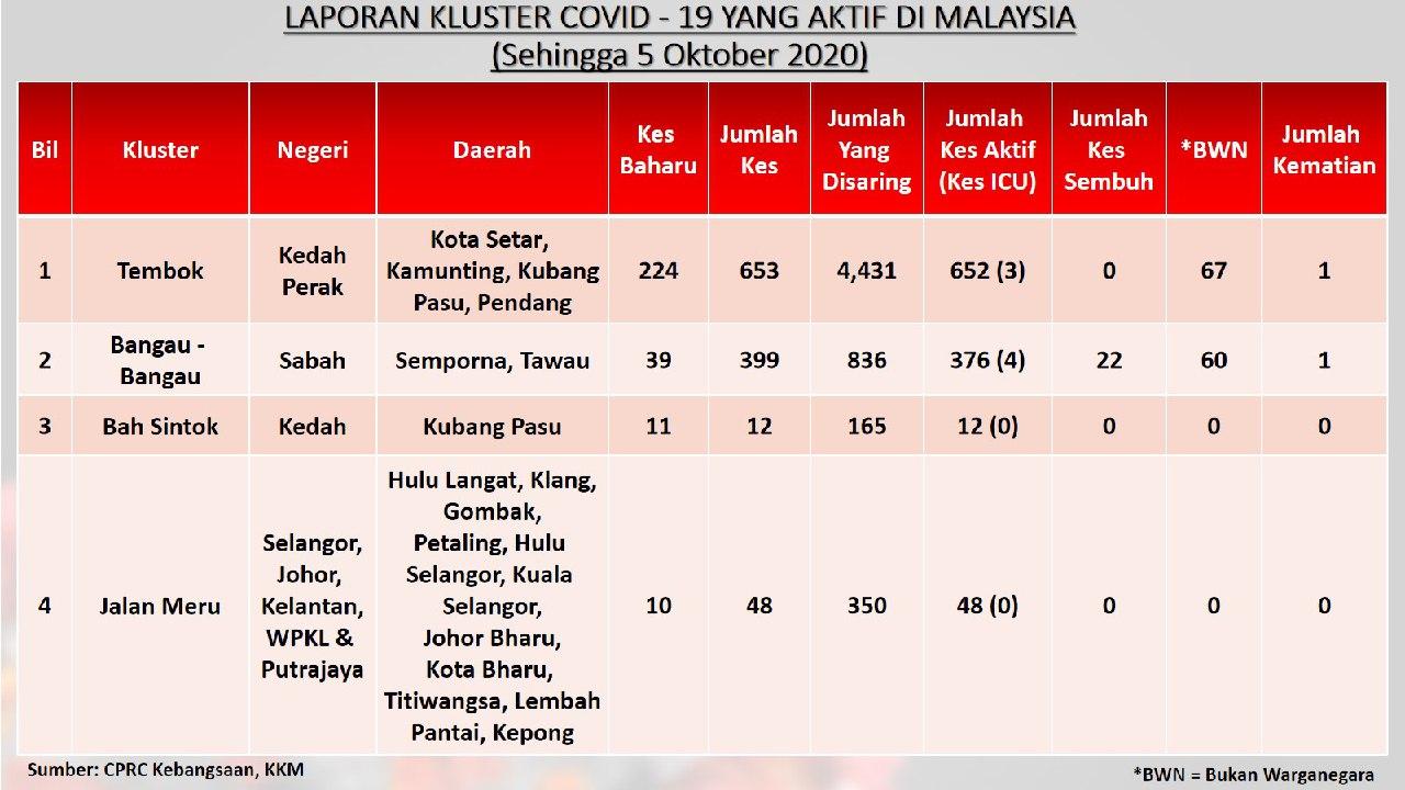 Laporan Kluster COVID-19 Aktif Di Malaysia 05/10/2020 Aiman Siaran Media 05 October 2020 Hits: 958 Rating: ( 0 Rating ) Please Rate Vote 1 Vote 2 Vote 3 Vote 4 Vote 5 Facebook Twitter Prev Next