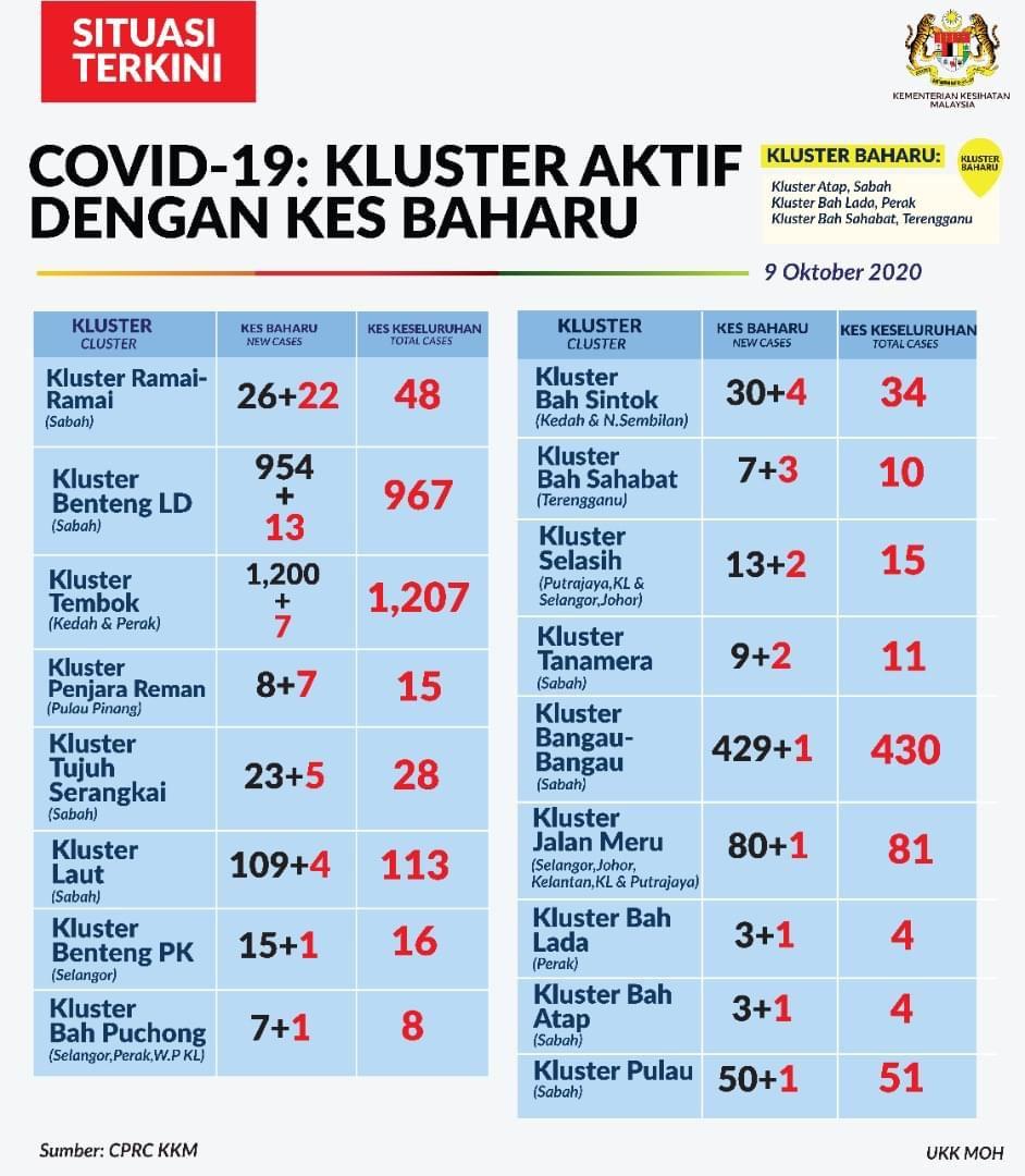 Rumusan Situasi Terkini Kluster Aktif COVID-19 Di Malaysia 09/10/2020 Aiman Siaran Media 09 October 2020 Hits: 685 Rating: ( 0 Rating ) Please Rate Vote 1 Vote 2 Vote 3 Vote 4 Vote 5 Lihat / Muat Turun JPG Facebook Twitter Prev Next