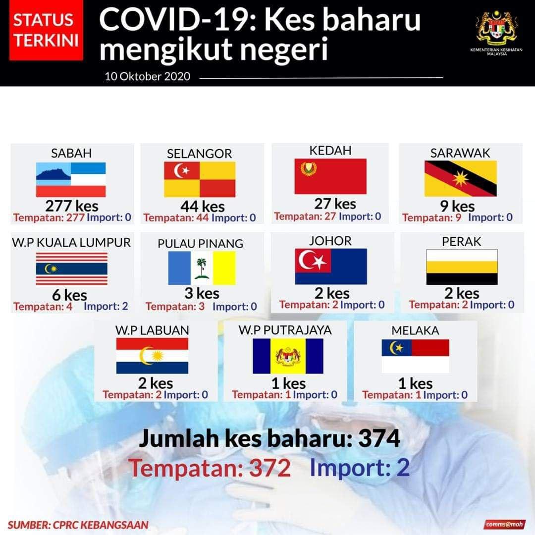 Status Terkini Kes Baharu Jangkitan COVID-19 Mengikut Negeri Di Malaysia 10/10/2020 Aiman Siaran Media 10 October 2020 Hits: 984 Rating: ( 0 Rating ) Please Rate Vote 1 Vote 2 Vote 3 Vote 4 Vote 5 Lihat / Muat Turun JPG Facebook Twitter Prev Next