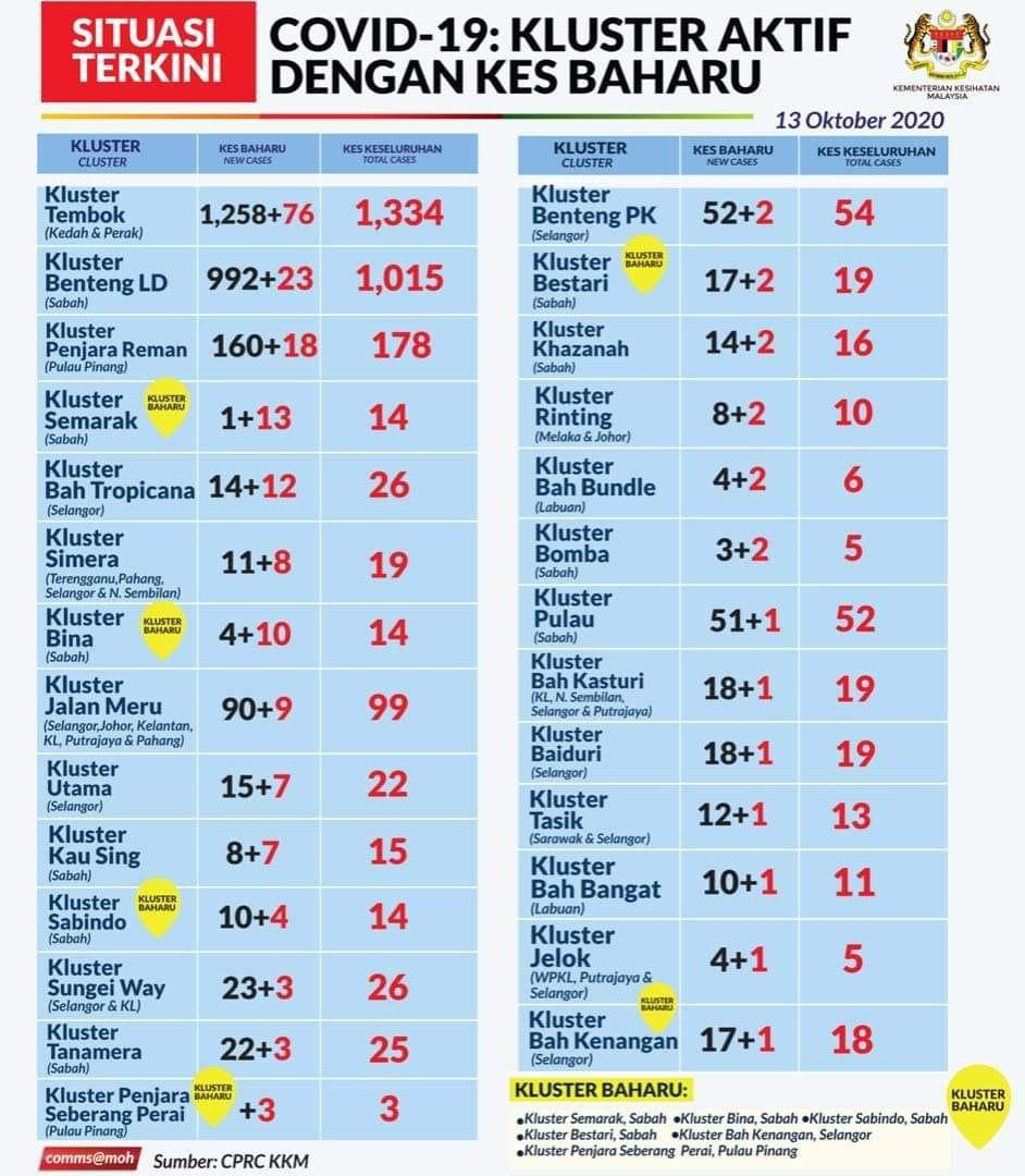 Rumusan Situasi Terkini Kluster Aktif COVID-19 Di Malaysia 13/10/2020 Aiman Siaran Media 13 October 2020 Hits: 507 Rating: ( 0 Rating ) Please Rate Vote 1 Vote 2 Vote 3 Vote 4 Vote 5 Lihat / Muat Turun JPG Facebook Twitter Prev Next