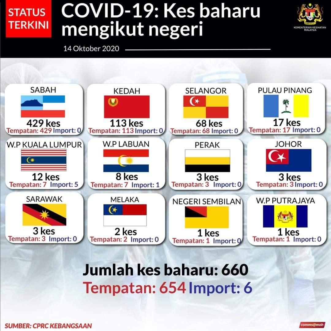 Status Terkini Kes Baharu Jangkitan COVID-19 Mengikut Negeri Di Malaysia 14/10/2020 Aiman Siaran Media 14 October 2020 Hits: 1455 Rating: ( 0 Rating ) Please Rate Vote 1 Vote 2 Vote 3 Vote 4 Vote 5 Lihat / Muat Turun JPG Facebook Twitter Prev Next