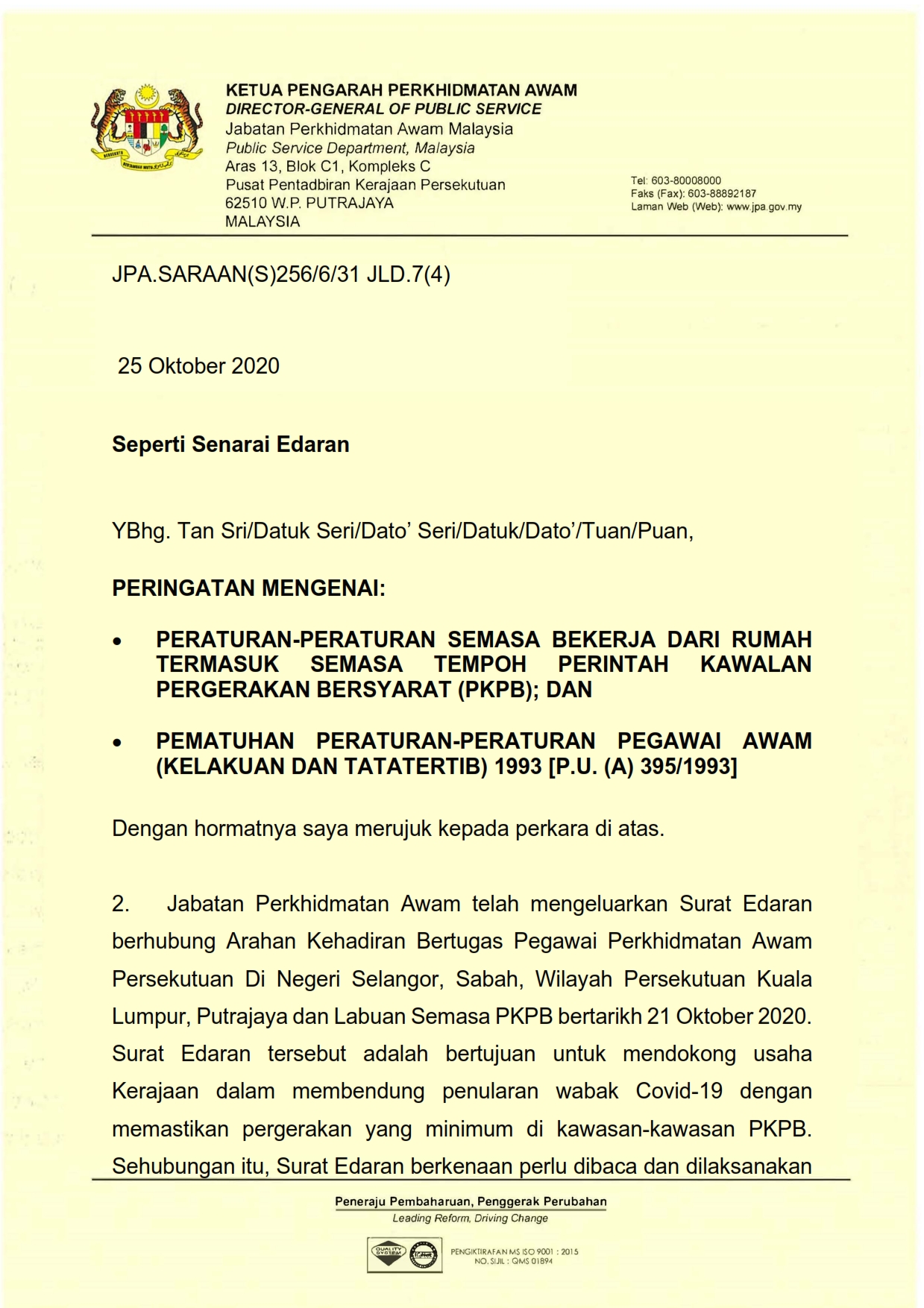 Surat Edaran Ketua Pengarah Perkhidmatan Awam 25/10/2020 Aiman Siaran Media 25 October 2020 Hits: 1470 Rating: ( 0 Rating ) Please Rate Vote 1 Vote 2 Vote 3 Vote 4 Vote 5 Lihat / Muat Turun PDF Facebook Twitter Prev Next
