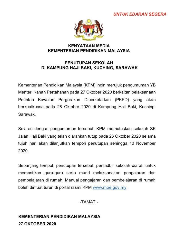 Kenyataan Media Kementerian Pendidikan Malaysia 27/10/2020 Aiman Siaran Media 27 October 2020 Hits: 816 Rating: ( 0 Rating ) Please Rate Vote 1 Vote 2 Vote 3 Vote 4 Vote 5 Lihat / Muat Turun JPG 1 Facebook Twitter Prev Next