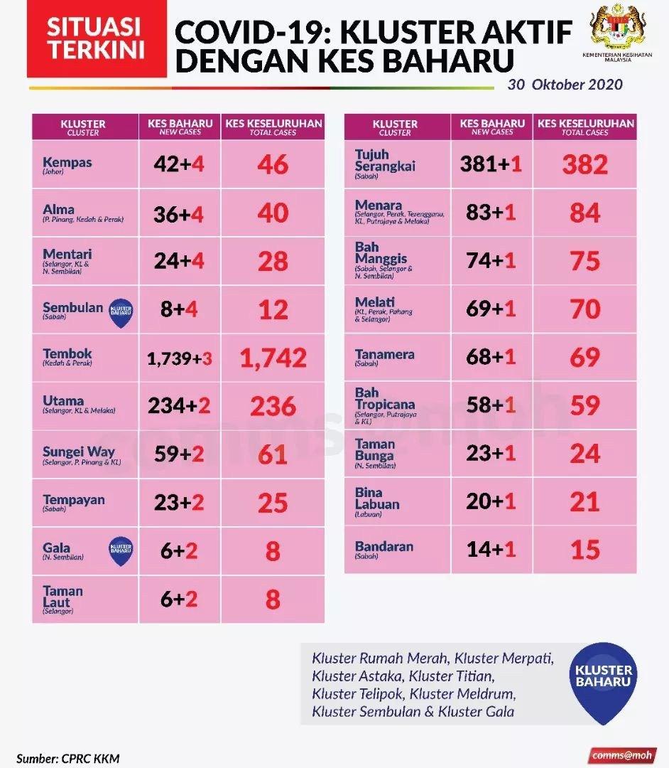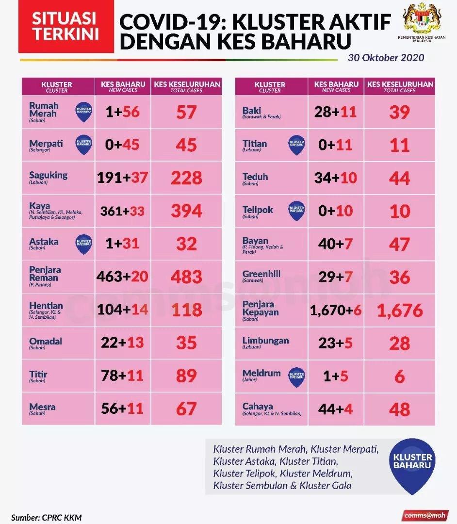 Situasi Terkini Kluster Aktif Dengan Kes Baharu Covid-19 30/10/2020 Aiman Siaran Media 30 October 2020 Hits: 633 Rating: ( 0 Rating ) Please Rate Vote 1 Vote 2 Vote 3 Vote 4 Vote 5 Lihat / Muat Turun JPG 1 Lihat / Muat Turun JPG 2 Facebook Twitter Prev Next