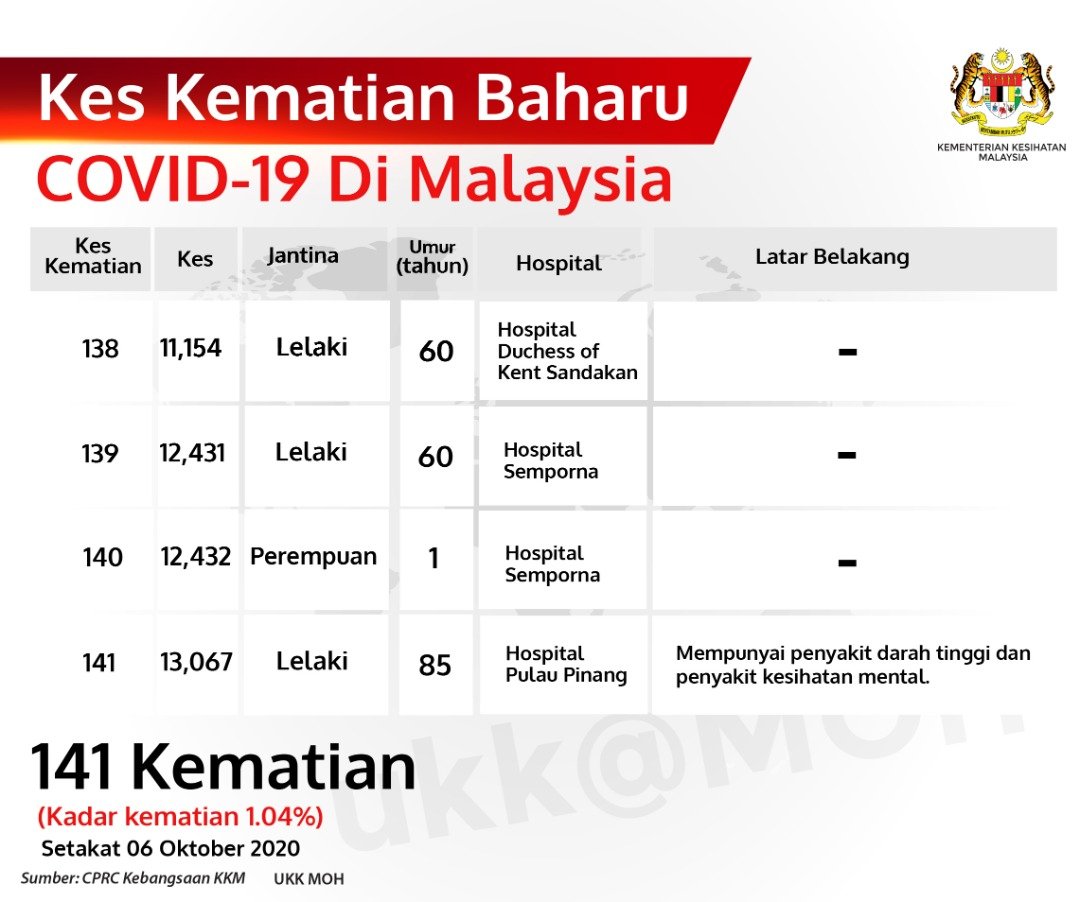 Kes Kematian Baharu COVID-19 Di Malaysia 06/10/2020 Aiman Siaran Media 06 Oktober 2020 Jumlah paparan: 791 Rating: ( 0 Rating ) Sila beri kadar Undi 1 Undi 2 Undi 3 Undi 4 Undi 5 Lihat / Muat Turun JPG Facebook Twitter Seterusnya Seterusnya