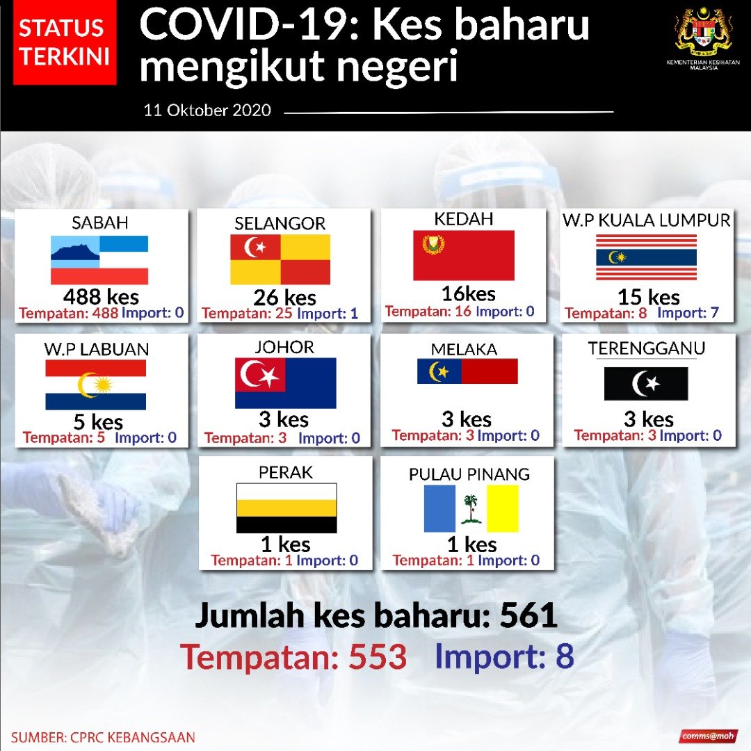 Status Terkini Kes Baharu Jangkitan COVID-19 Mengikut Negeri Di Malaysia 11/10/2020 Aiman Siaran Media 11 Oktober 2020 Jumlah paparan: 830 Rating: ( 0 Rating ) Sila beri kadar Undi 1 Undi 2 Undi 3 Undi 4 Undi 5 Lihat / Muat Turun JPG Facebook Twitter Seterusnya Seterusnya