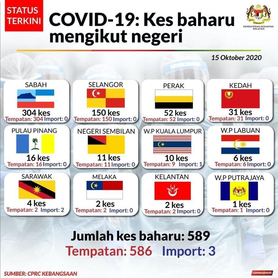 Status Terkini Kes Baharu Jangkitan COVID-19 Mengikut Negeri Di Malaysia 15/10/2020 Aiman Siaran Media 15 Oktober 2020 Jumlah paparan: 893 Rating: ( 0 Rating ) Sila beri kadar Undi 1 Undi 2 Undi 3 Undi 4 Undi 5 Lihat / Muat Turun JPG Facebook Twitter Seterusnya Seterusnya