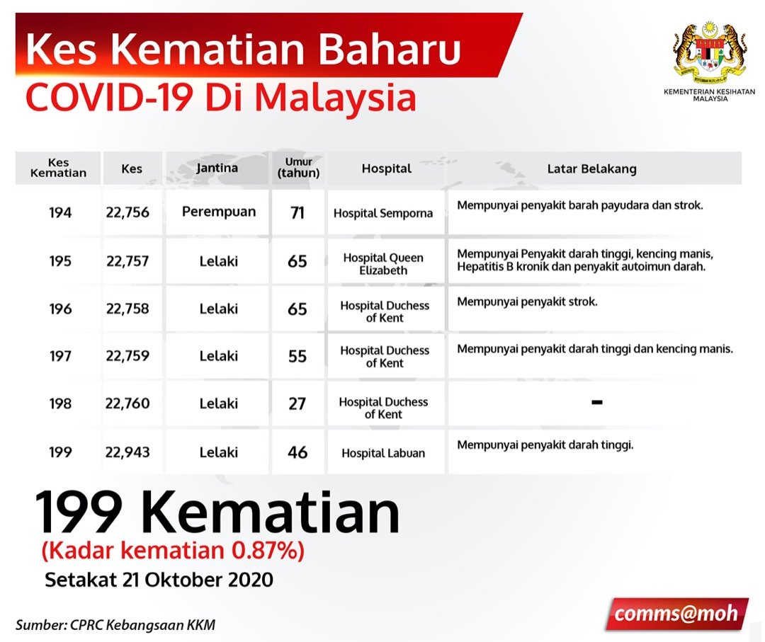 Kes Kematian Baharu COVID-19 Di Malaysia 21/10/2020 Aiman Siaran Media 21 Oktober 2020 Jumlah paparan: 751 Rating: ( 0 Rating ) Sila beri kadar Undi 1 Undi 2 Undi 3 Undi 4 Undi 5 Lihat / Muat Turun JPG Facebook Twitter Seterusnya Seterusnya