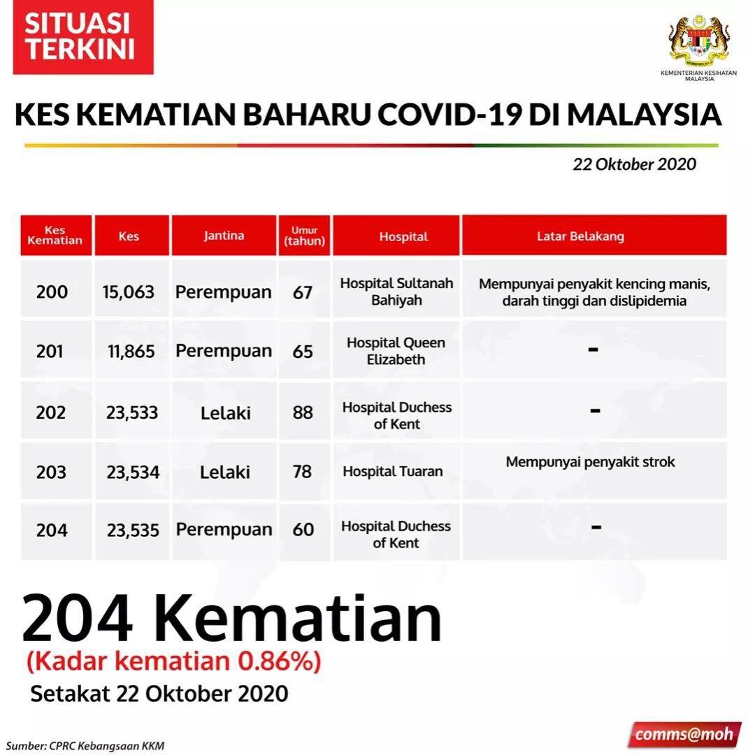 Kes Kematian Baharu COVID-19 Di Malaysia 22/10/2020 Aiman Siaran Media 22 Oktober 2020 Jumlah paparan: 753 Rating: ( 0 Rating ) Sila beri kadar Undi 1 Undi 2 Undi 3 Undi 4 Undi 5 Lihat / Muat Turun JPG Facebook Twitter Seterusnya Seterusnya