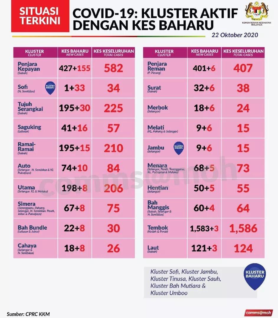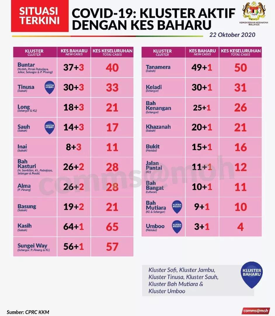 Situasi Terkini Kluster Aktif Dengan Kes Baharu Covid-19 22/10/2020 Aiman Siaran Media 22 Oktober 2020 Jumlah paparan: 818 Rating: ( 0 Rating ) Sila beri kadar Undi 1 Undi 2 Undi 3 Undi 4 Undi 5 Lihat / Muat Turun JPG 1 Lihat / Muat Turun JPG 2 Facebook Twitter Seterusnya Seterusnya