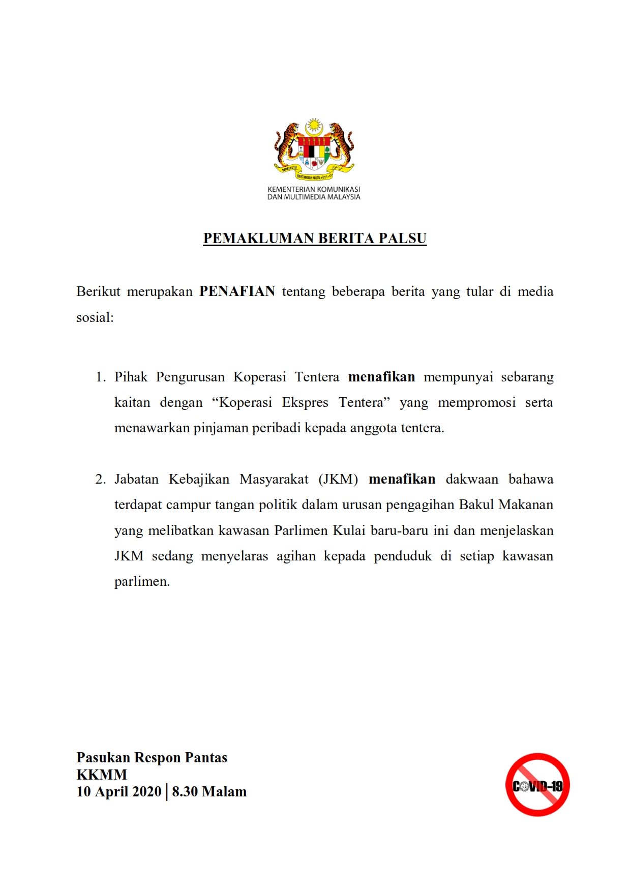Pemakluman Berita Palsu SKMM 10/04/2020 0830 PM Aiman Siaran Media 10 April 2020 Hits: 943 Rating: ( 0 Rating ) Please Rate Vote 1 Vote 2 Vote 3 Vote 4 Vote 5 Lihat / Muat Turun PDF Facebook Twitter Prev Next