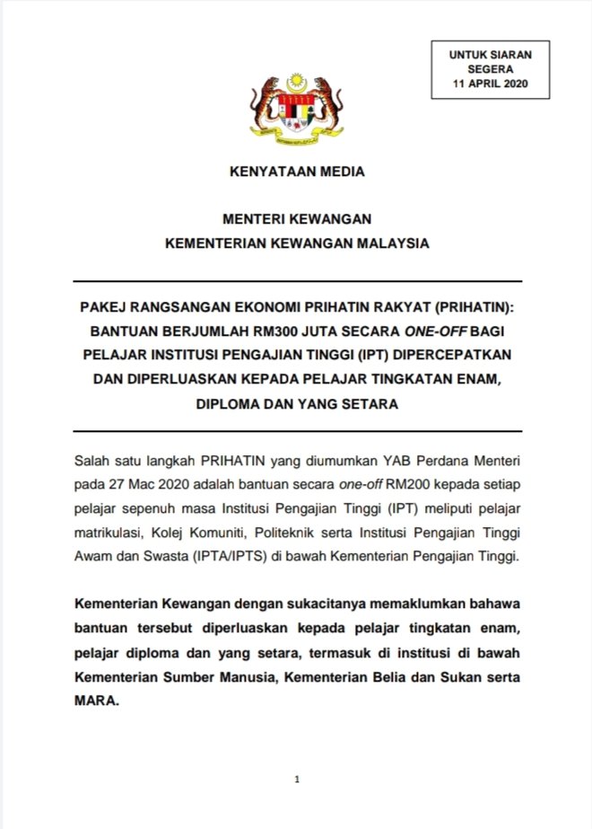 Kenyataan Media Menteri Kewangan Malaysia 11/04/2020 Asrul Siaran Media 11 April 2020 Hits: 733 Rating: ( 0 Rating ) Please Rate Vote 1 Vote 2 Vote 3 Vote 4 Vote 5 Lihat / Muat Turun JPG Facebook Twitter Prev Next