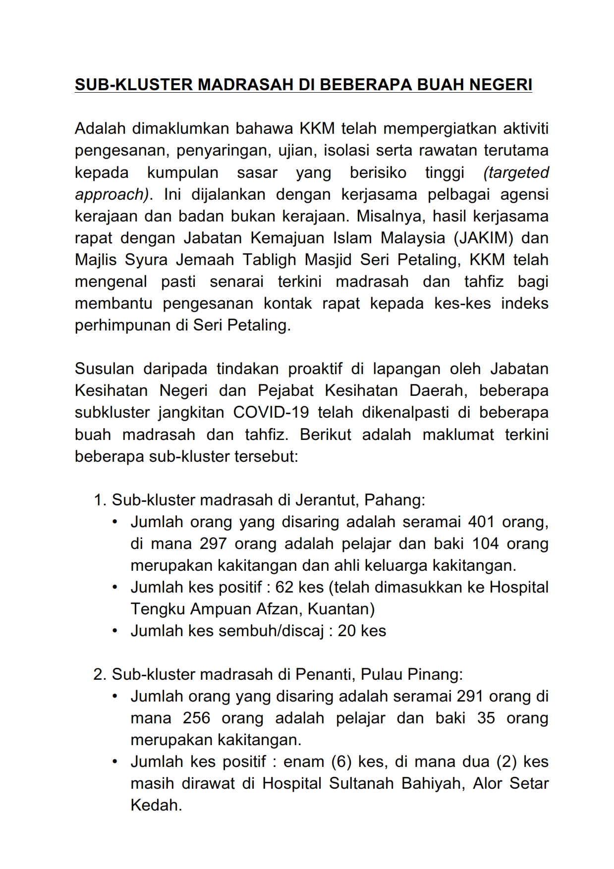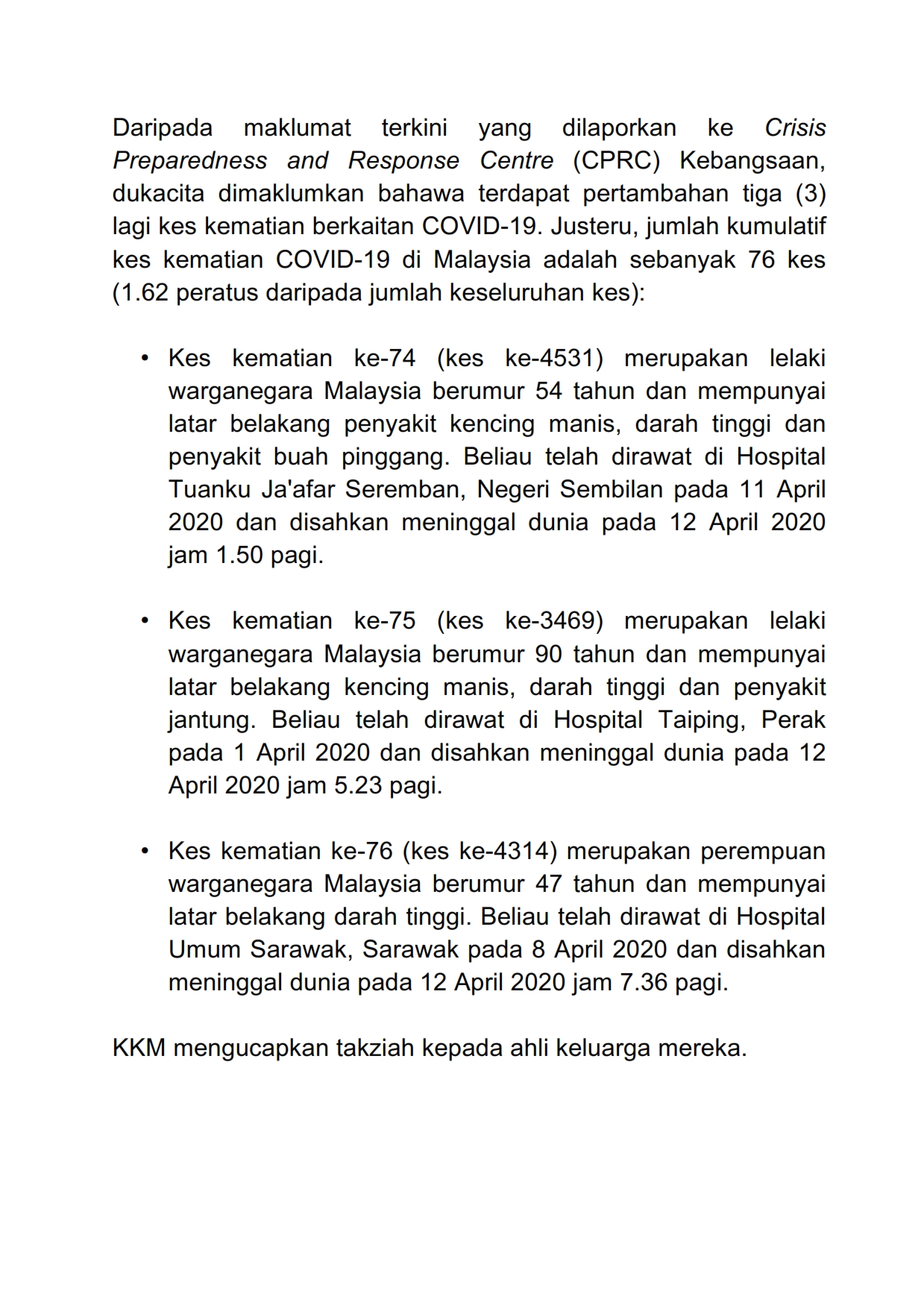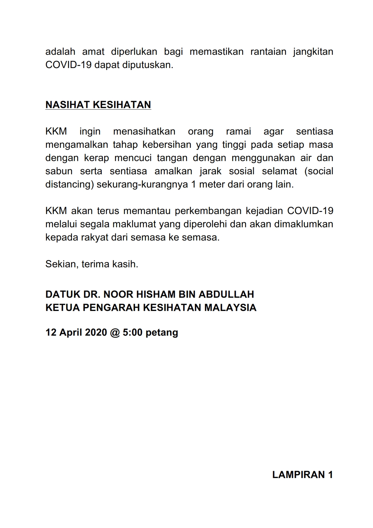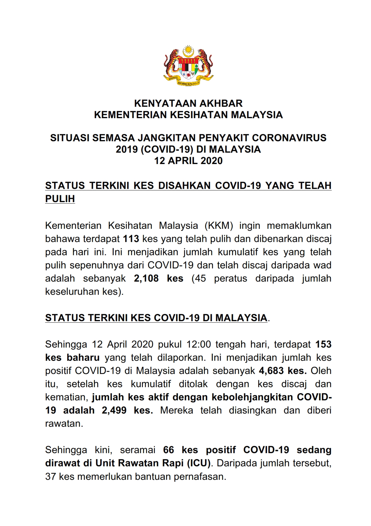 Kenyataan Akhbar KP KKM 12/04/2020 0500 PM Aiman Siaran Media 12 April 2020 Hits: 954 Rating: ( 0 Rating ) Please Rate Vote 1 Vote 2 Vote 3 Vote 4 Vote 5 Lihat / Muat Turun PDF Facebook Twitter Prev Next