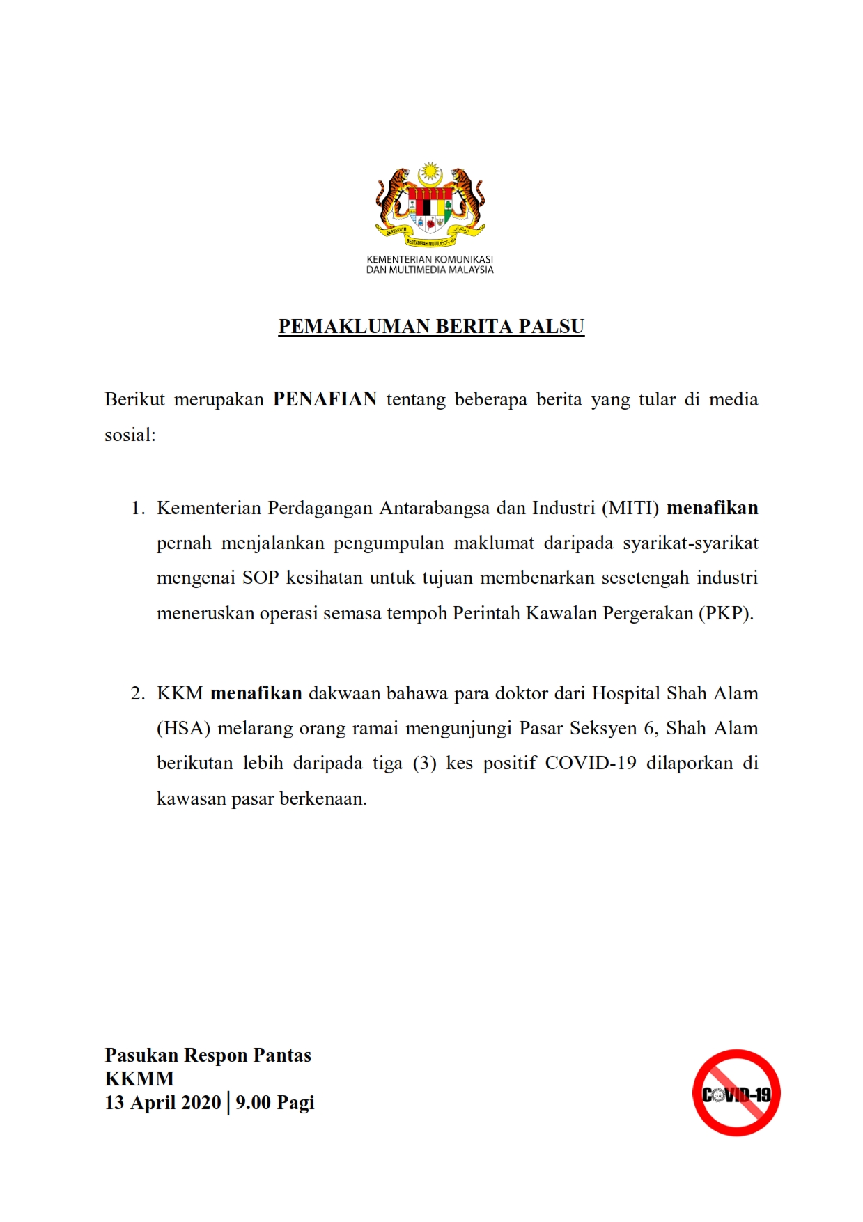 Pemakluman Berita Palsu SKMM 13/04/2020 0900 AM Aiman Siaran Media 13 April 2020 Hits: 1016 Rating: ( 0 Rating ) Please Rate Vote 1 Vote 2 Vote 3 Vote 4 Vote 5 Lihat / Muat Turun PDF Facebook Twitter Prev Next
