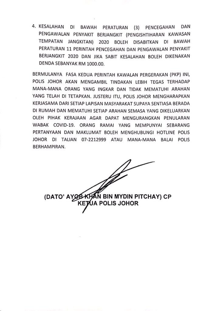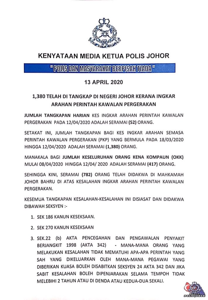 Kenyataan Media Ketua Polis Johor 13/04/2020 0400 PM Asrul Siaran Media 13 April 2020 Hits: 1196 Rating: ( 0 Rating ) Please Rate Vote 1 Vote 2 Vote 3 Vote 4 Vote 5 Lihat / Muat Turun JPG 1 Lihat / Muat Turun JPG 2 Facebook Twitter Prev Next