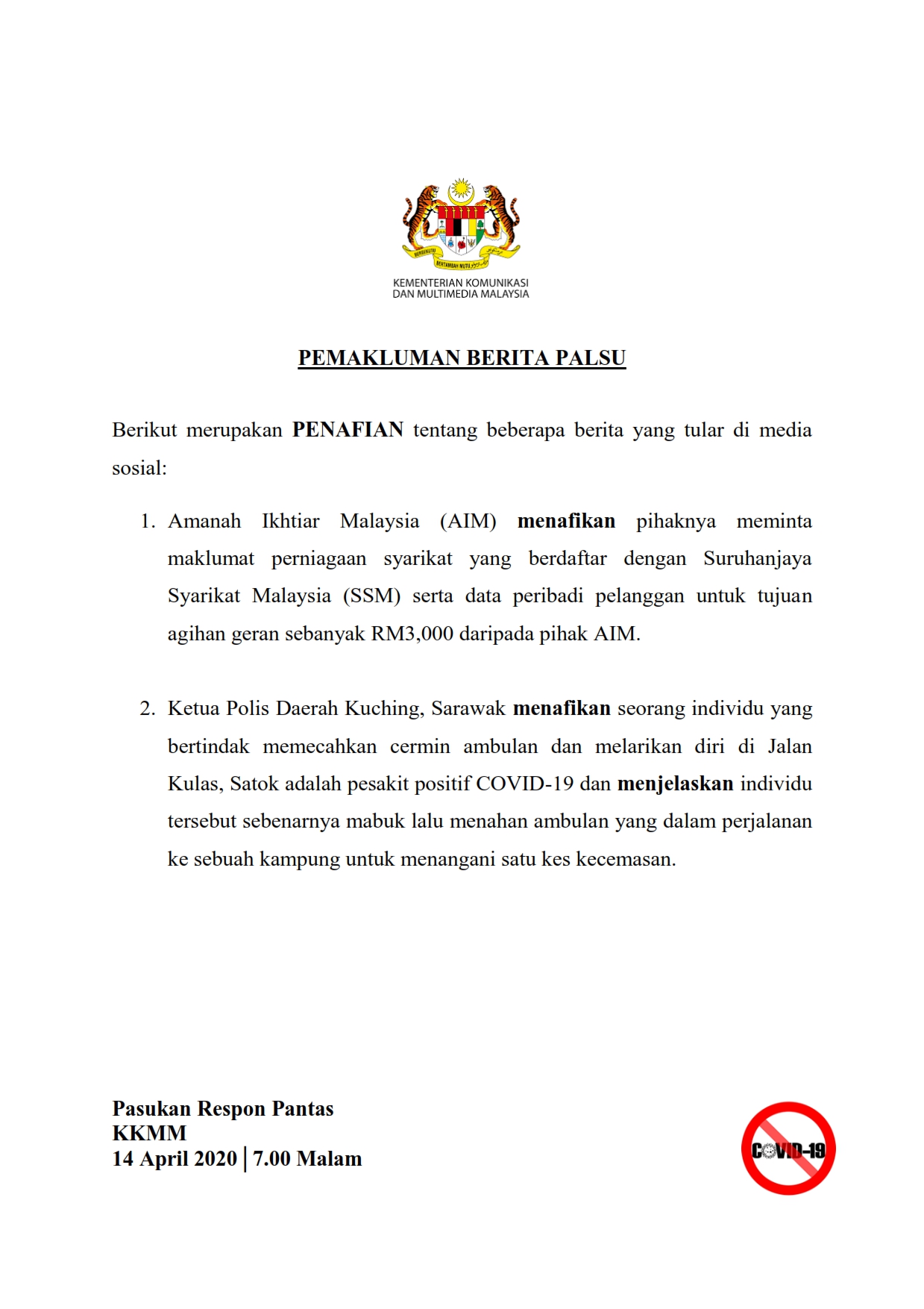 Pemakluman Berita Palsu SKMM 14/04/2020 0700 PM Asrul Siaran Media 14 April 2020 Hits: 1065 Rating: ( 0 Rating ) Please Rate Vote 1 Vote 2 Vote 3 Vote 4 Vote 5 Lihat / Muat Turun PDF Facebook Twitter Prev Next