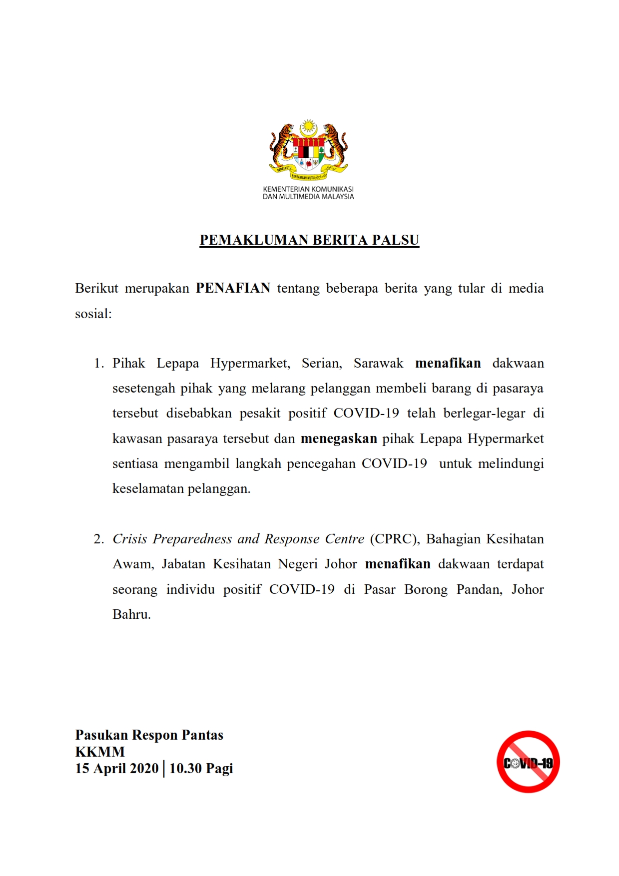 Pemakluman Berita Palsu SKMM 15/04/2020 1030 AM Aiman Siaran Media 15 April 2020 Hits: 772 Rating: ( 0 Rating ) Please Rate Vote 1 Vote 2 Vote 3 Vote 4 Vote 5 Lihat / Muat Turun PDF Facebook Twitter Prev Next