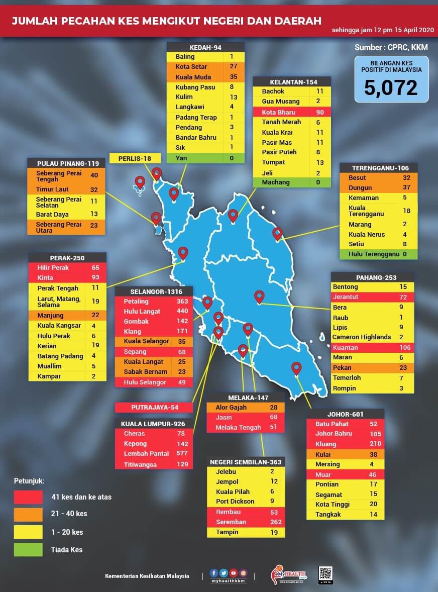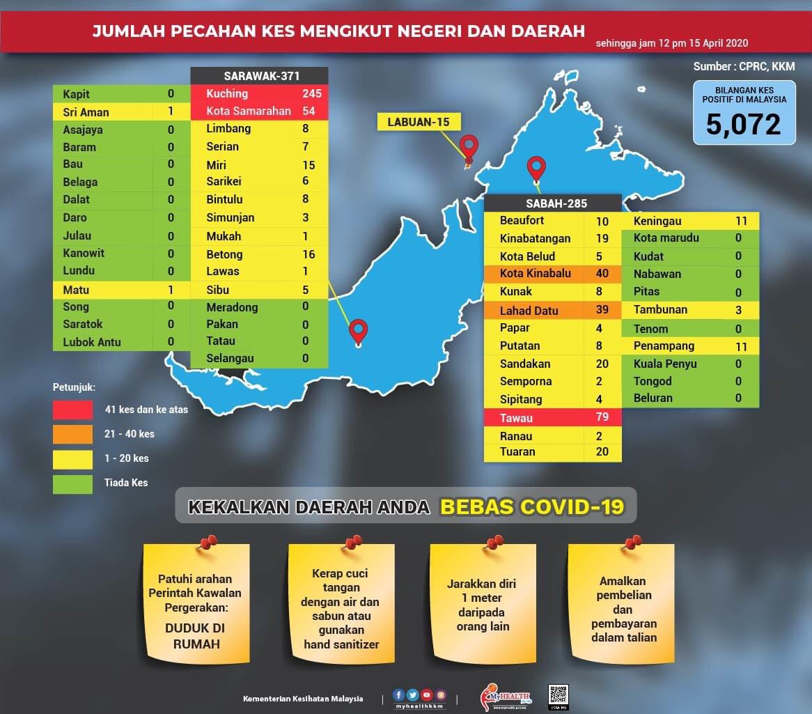 Statistik Pecahan Kes COVID-19 Mengikut Negeri & Daerah Di Malaysia 15/04/2020 1200 PM Asrul Siaran Media 15 April 2020 Hits: 787 Rating: ( 0 Rating ) Please Rate Vote 1 Vote 2 Vote 3 Vote 4 Vote 5 Lihat / Muat Turun JPG 1 Lihat / Muat Turun JPG 2 Facebook Twitter Prev Next