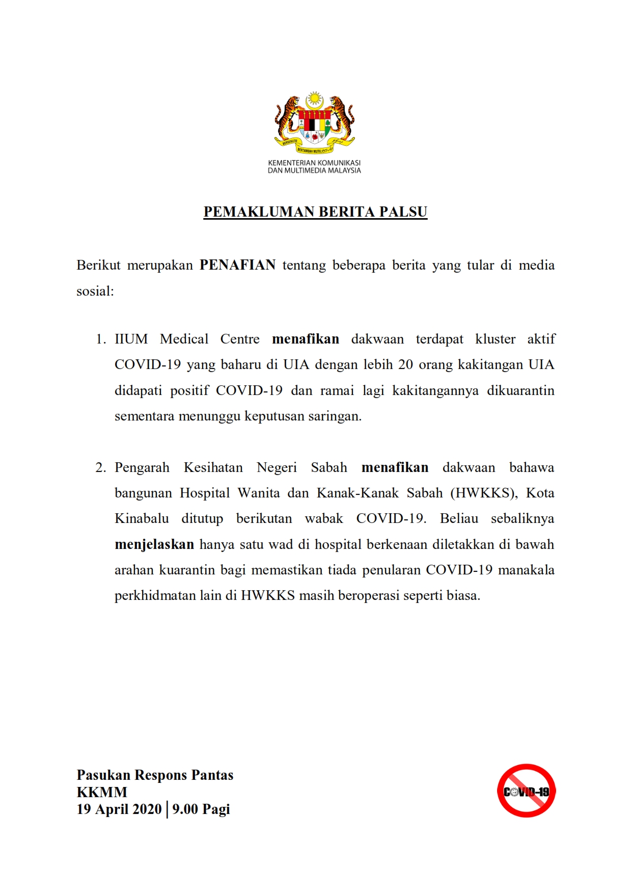 Pemakluman Berita Palsu SKMM 19/04/2020 0900 AM Asrul Siaran Media 19 April 2020 Hits: 912 Rating: ( 0 Rating ) Please Rate Vote 1 Vote 2 Vote 3 Vote 4 Vote 5 Lihat / Muat Turun PDF Facebook Twitter Prev Next