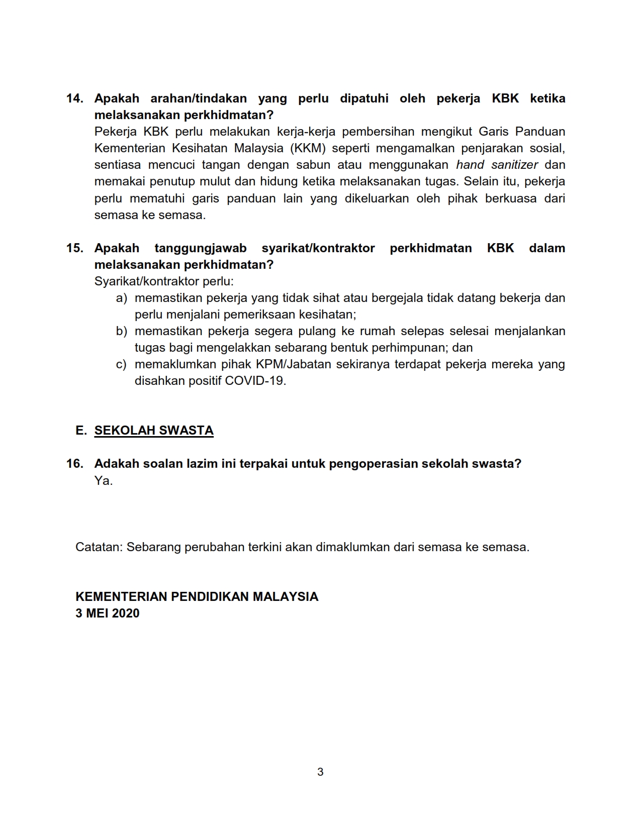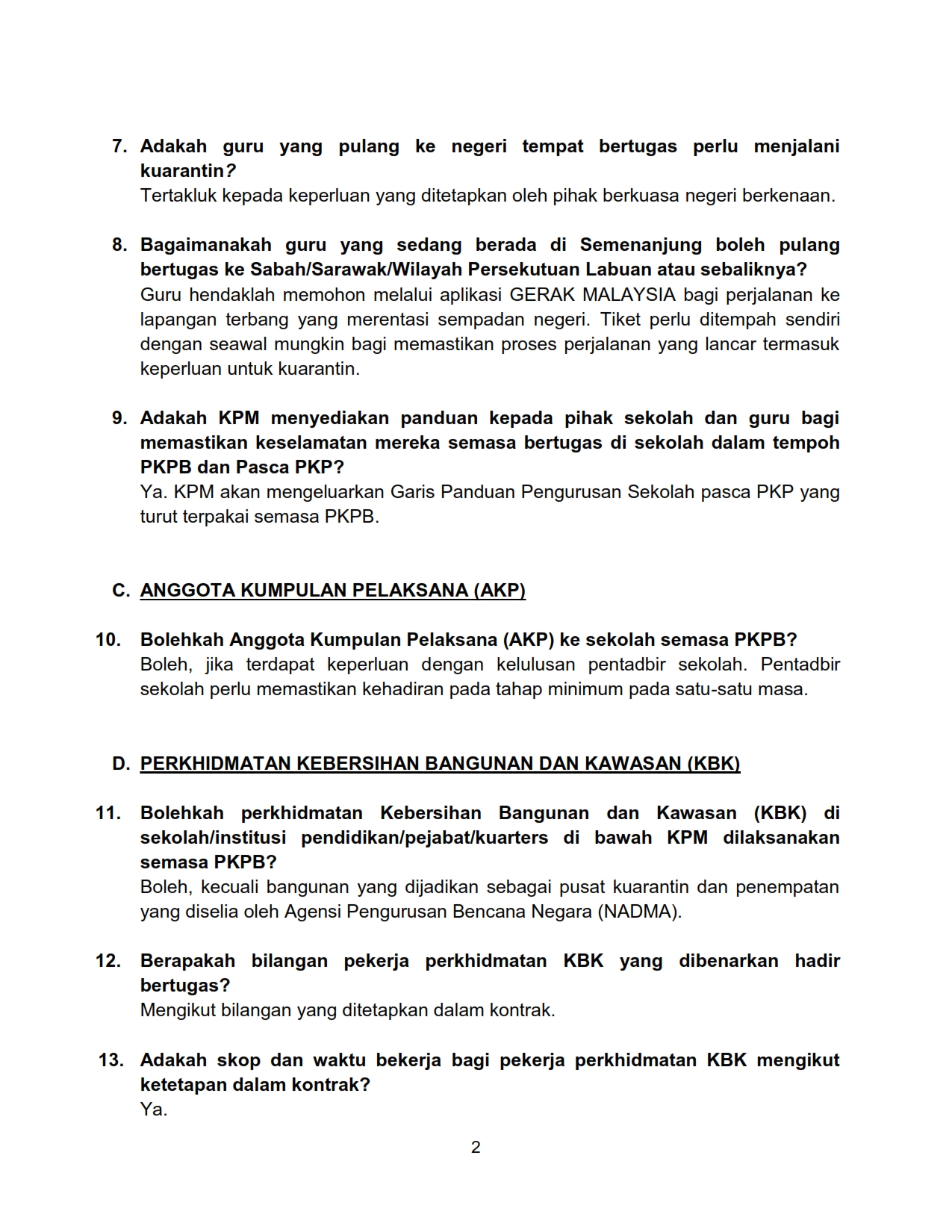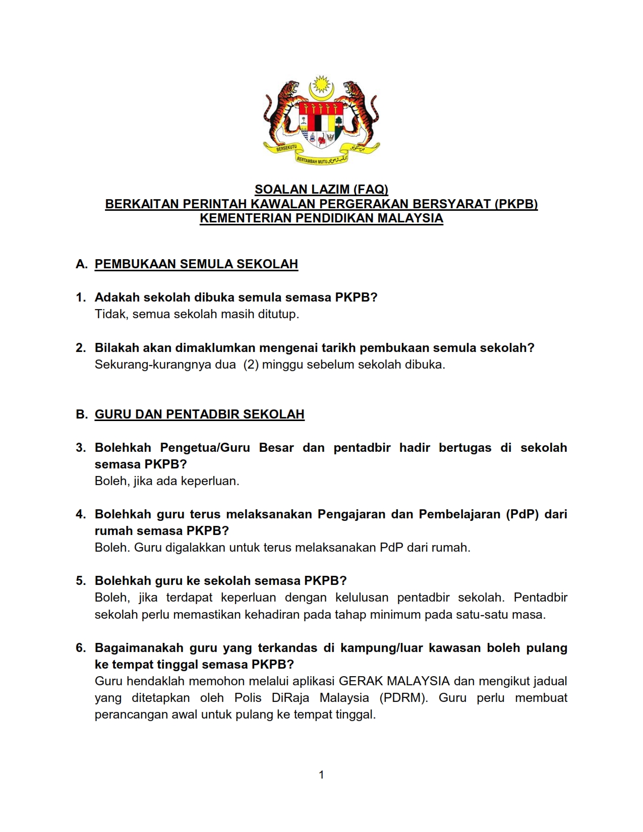 Soalan Lazim FAQ Berkaitan Perintah Kawalan Pergerakan Bersyarat (PKPB) Kementerian Pendidikan Malaysia 03/05/2020 Aiman FAQ 03 May 2020 Hits: 1397 Rating: ( 0 Rating ) Please Rate Vote 1 Vote 2 Vote 3 Vote 4 Vote 5 /bencana2/images/ndcc/documents/covid19/faq/SIARAN_MEDIA_KKM_20200503_04.pdf Facebook Twitter Prev Next
