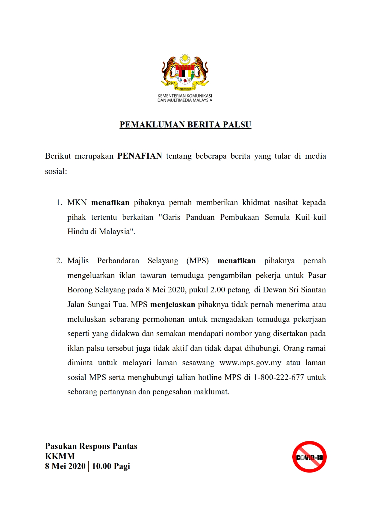 Pemakluman Berita Palsu SKMM 08/05/2020 1000 AM Aiman Siaran Media 08 May 2020 Hits: 716 Rating: ( 0 Rating ) Please Rate Vote 1 Vote 2 Vote 3 Vote 4 Vote 5 Lihat / Muat Turun PDF Facebook Twitter Prev Next