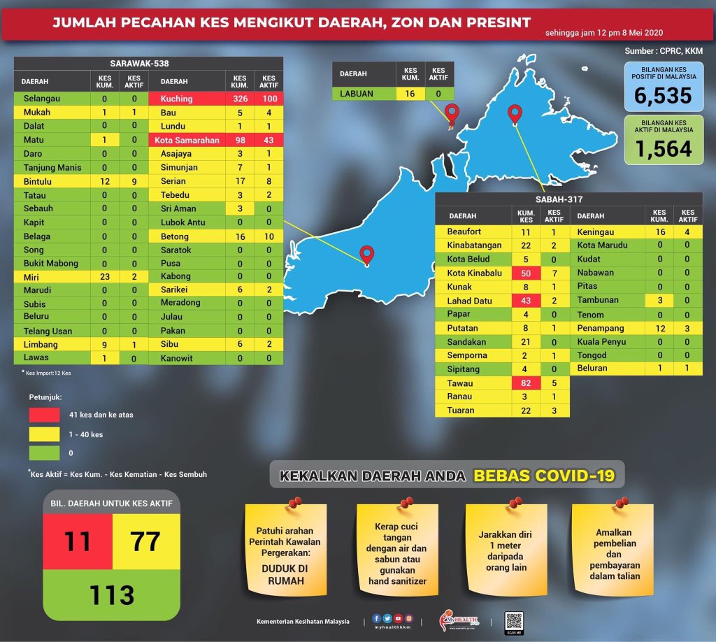 Statistik Pecahan Kes COVID-19 Mengikut Negeri & Daerah Di Malaysia 08/05/2020 1200 PM Asrul Siaran Media 08 May 2020 Hits: 951 Rating: ( 0 Rating ) Please Rate Vote 1 Vote 2 Vote 3 Vote 4 Vote 5 Lihat / Muat Turun JPG 1 Lihat / Muat Turun JPG 2 Facebook Twitter Prev Next