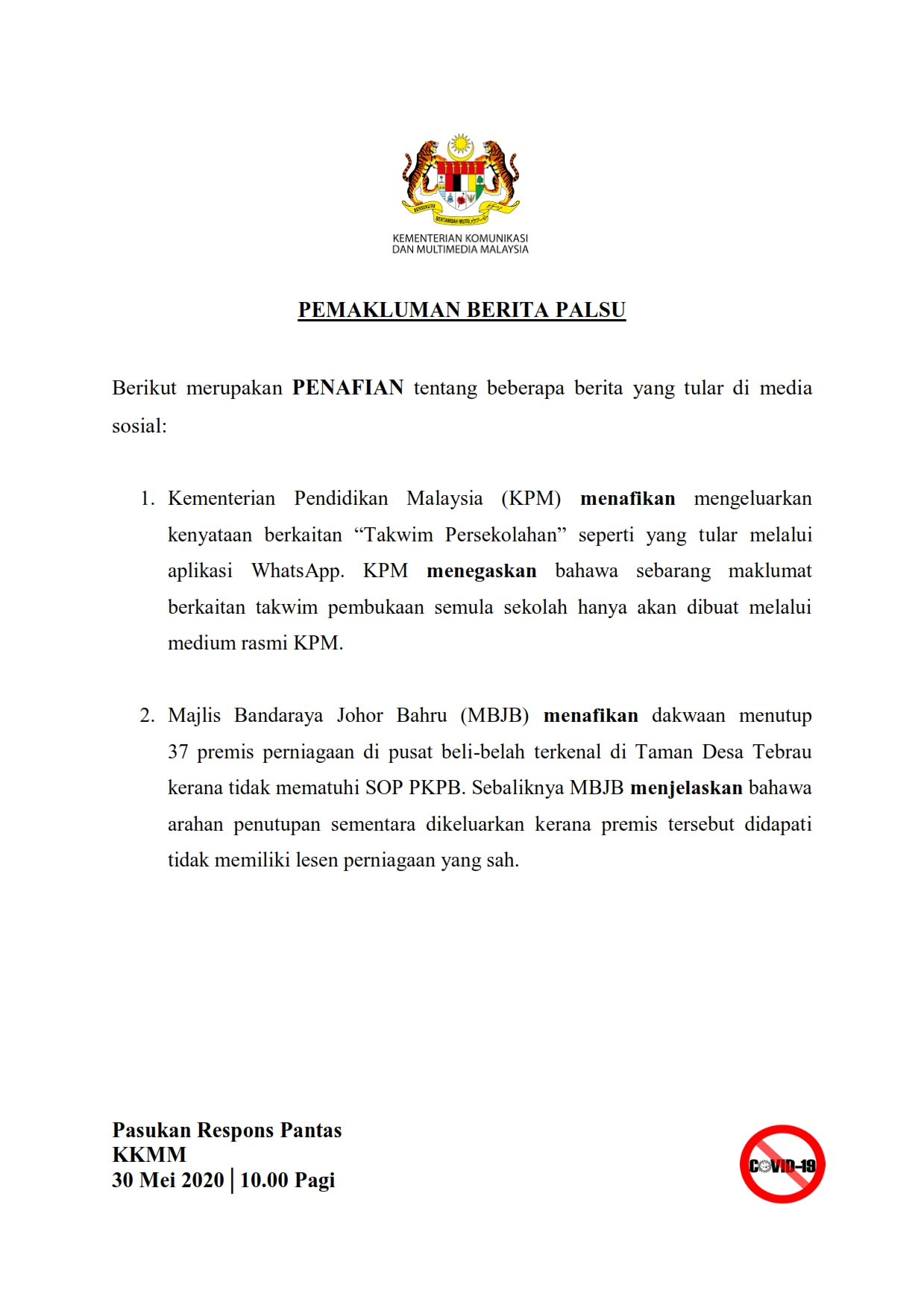 Pemakluman Berita Palsu SKMM 30/05/2020 1000 AM Aiman Siaran Media 30 May 2020 Hits: 1041 Rating: ( 0 Rating ) Please Rate Vote 1 Vote 2 Vote 3 Vote 4 Vote 5 Lihat / Muat Turun PDF Facebook Twitter Prev Next