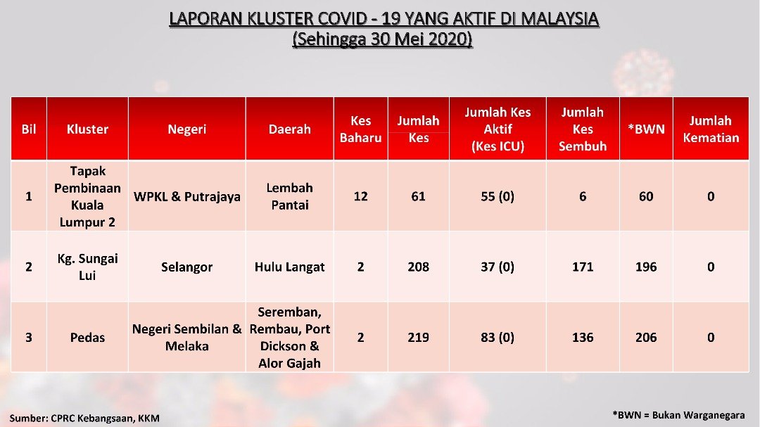 Laporan Kluster COVID-19 Aktif Di Malaysia 30/05/2020 Aiman Siaran Media 30 May 2020 Hits: 666 Rating: ( 0 Rating ) Please Rate Vote 1 Vote 2 Vote 3 Vote 4 Vote 5 Facebook Twitter Prev Next