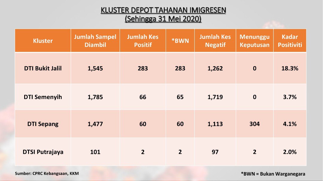 Laporan Saringan DEPOT Tahanan Imigresen Di Malaysia 31/05/2020 Aiman Siaran Media 31 May 2020 Hits: 926 Rating: ( 0 Rating ) Please Rate Vote 1 Vote 2 Vote 3 Vote 4 Vote 5 /bencana2/images/ndcc/documents/covid19/siaranmedia202004/SIARAN_MEDIA_KKM_20200531_04.jpg Facebook Twitter Prev Next