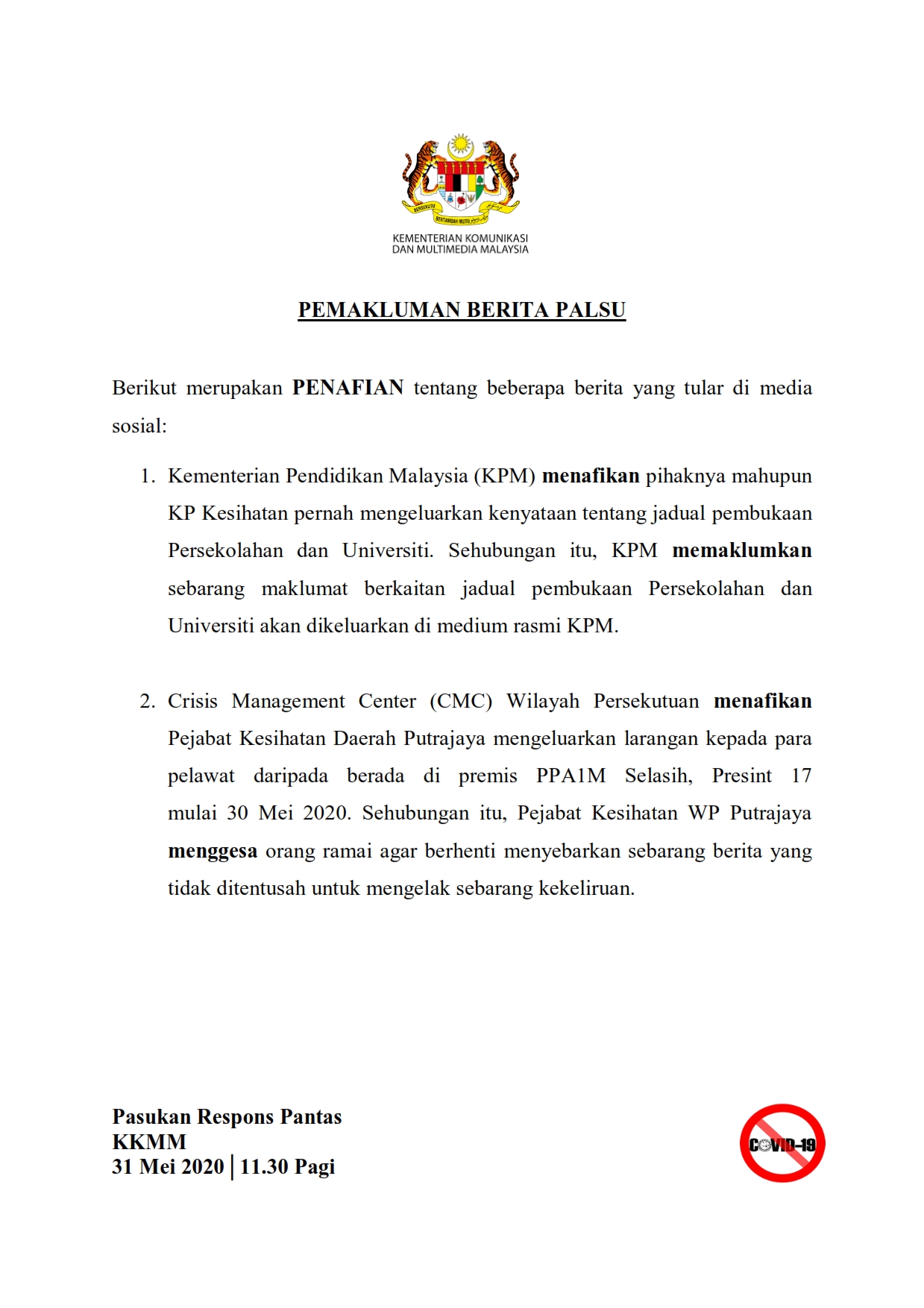 Pemakluman Berita Palsu SKMM 31/05/2020 1130 AM Aiman Siaran Media 31 May 2020 Hits: 812 Rating: ( 0 Rating ) Please Rate Vote 1 Vote 2 Vote 3 Vote 4 Vote 5 Lihat / Muat Turun PDF Facebook Twitter Prev Next