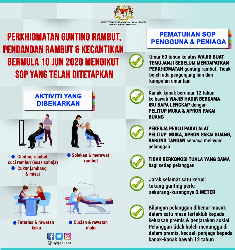 KPDNKK - Perkhidmatan Gunting Rambut, Pendandan Rambut dan Kecantikan Bermula 10 Jun 2020 Mengikut SOP Yang Ditetapkan Aiman Nasihat 08 June 2020 Hits: 1443 Rating: ( 0 Rating ) Please Rate Vote 1 Vote 2 Vote 3 Vote 4 Vote 5 Lihat / Muat Turun JPG Facebook Twitter Prev Next