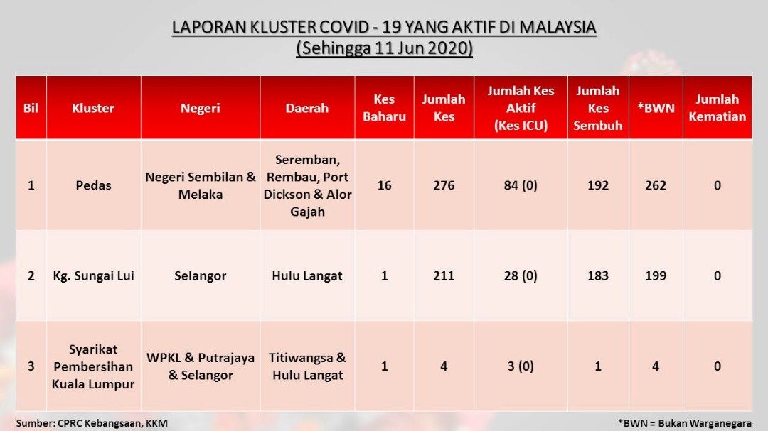 Laporan Kluster COVID-19 Aktif Di Malaysia 11/06/2020 Aiman Siaran Media 11 June 2020 Hits: 988 Rating: ( 0 Rating ) Please Rate Vote 1 Vote 2 Vote 3 Vote 4 Vote 5 Lihat / Muat Turun JPG Facebook Twitter Prev Next