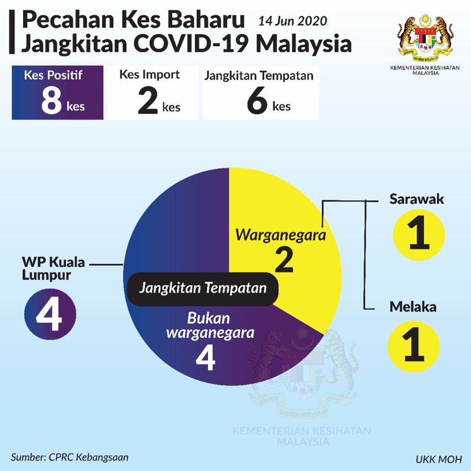 Statistik Pecahan Kes Baharu Jangkitan COVID-19 Malaysia 14/06/2020 Aiman Siaran Media 14 June 2020 Hits: 953 Rating: ( 0 Rating ) Please Rate Vote 1 Vote 2 Vote 3 Vote 4 Vote 5 Lihat / Muat Turun JPG Facebook Twitter Prev Next
