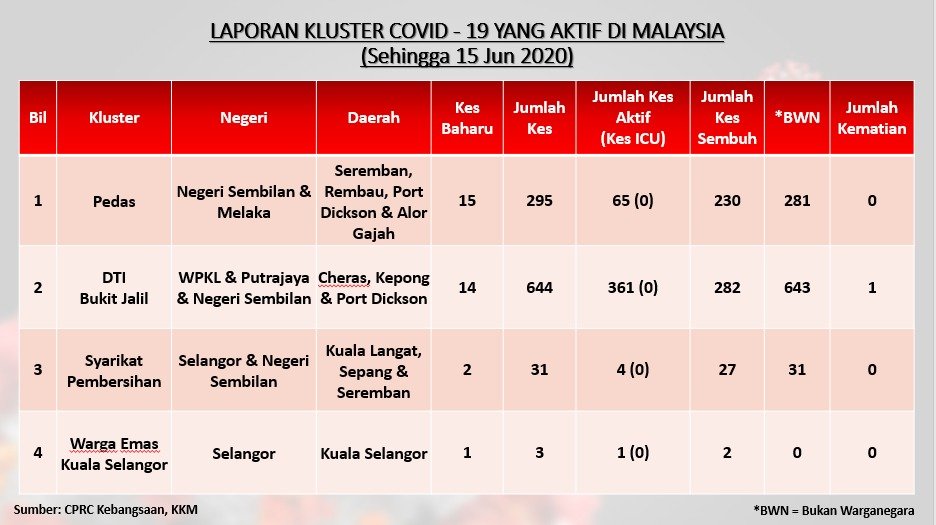 Laporan Kluster COVID-19 Aktif Di Malaysia 15/06/2020 Asrul Siaran Media 15 June 2020 Hits: 1106 Rating: ( 0 Rating ) Please Rate Vote 1 Vote 2 Vote 3 Vote 4 Vote 5 Facebook Twitter Prev Next