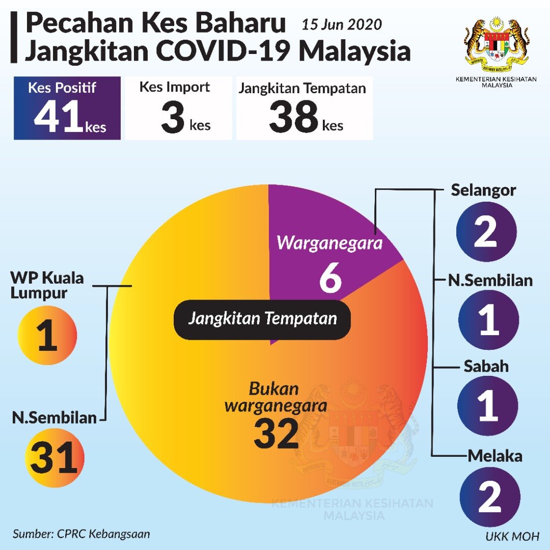 Statistik Pecahan Kes Baharu Jangkitan COVID-19 Malaysia 15/06/2020 Asrul Siaran Media 15 June 2020 Hits: 1336 Rating: ( 0 Rating ) Please Rate Vote 1 Vote 2 Vote 3 Vote 4 Vote 5 Lihat / Muat Turun JPG Facebook Twitter Prev Next