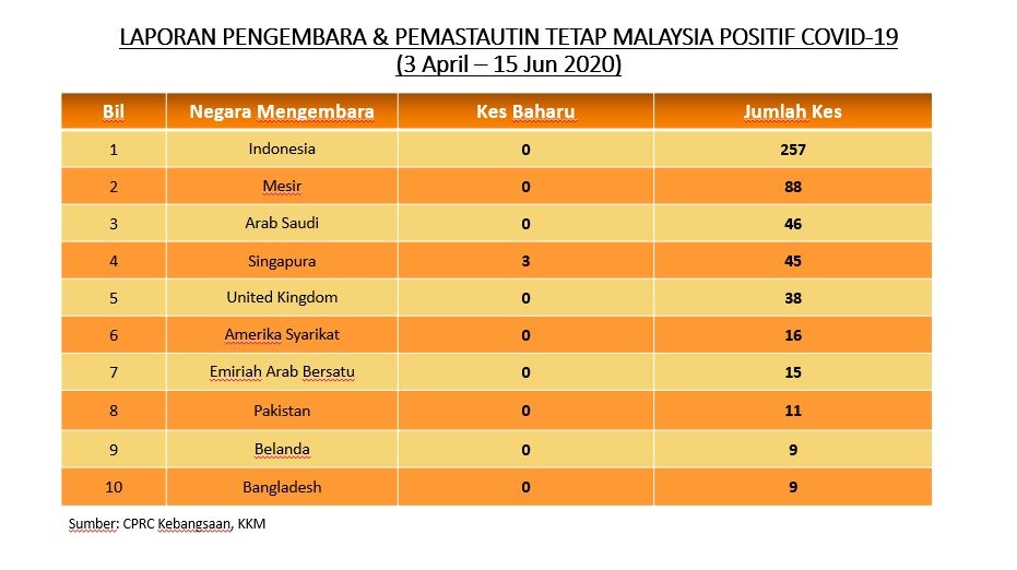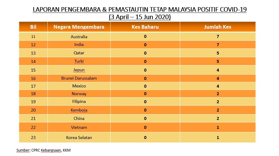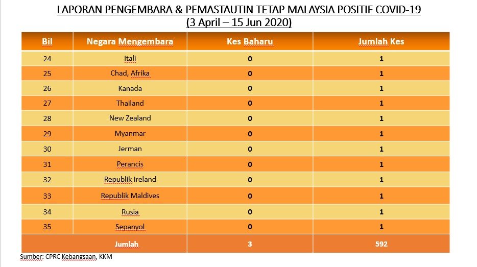 Laporan Pengembara & Pemastautin Tetap Malaysia Positif COVID-19 15/06/2020 Asrul Siaran Media 15 June 2020 Hits: 869 Rating: ( 0 Rating ) Please Rate Vote 1 Vote 2 Vote 3 Vote 4 Vote 5 Facebook Twitter Prev Next