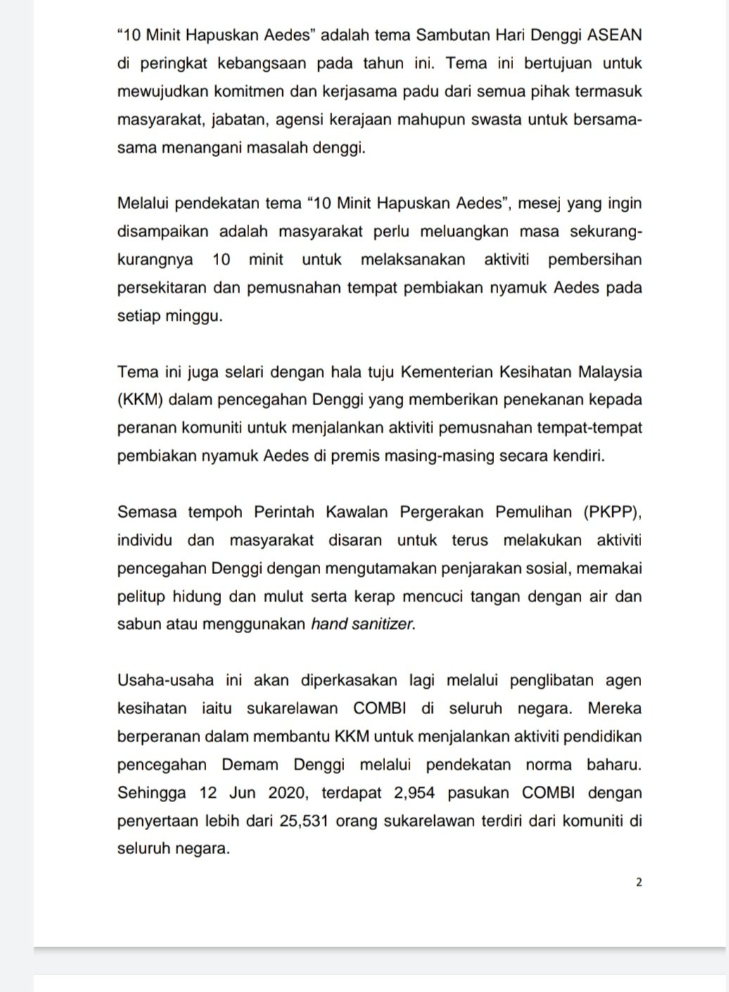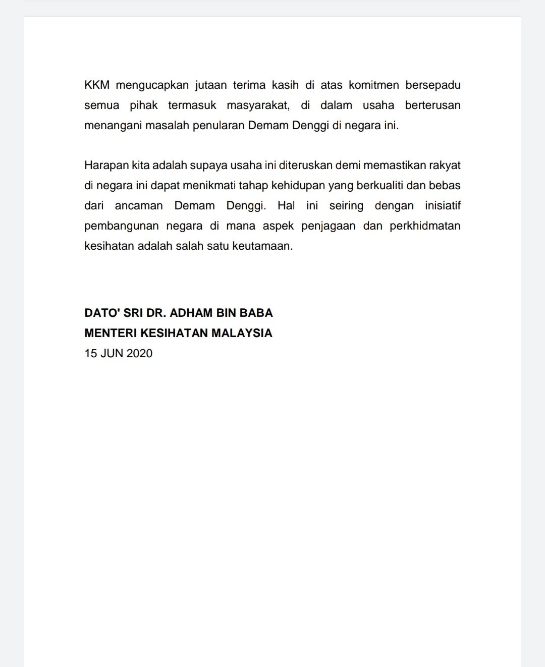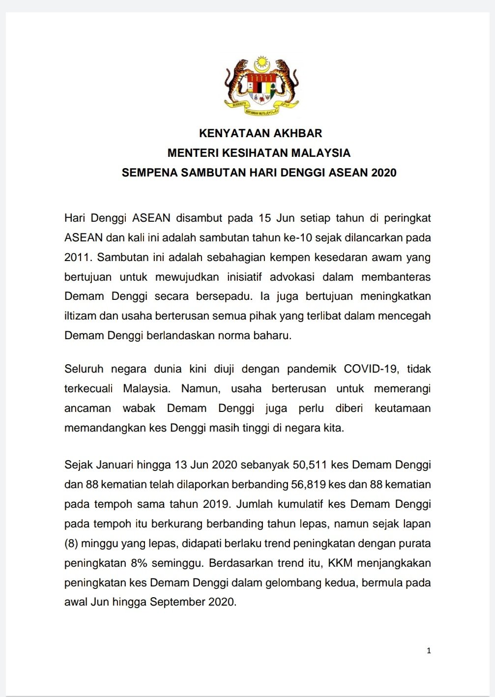 Kenyataan Akhbar Menteri Kesihatan Malaysia 15/06/2020 Asrul Siaran Media 15 June 2020 Hits: 829 Rating: ( 0 Rating ) Please Rate Vote 1 Vote 2 Vote 3 Vote 4 Vote 5 Facebook Twitter Prev Next