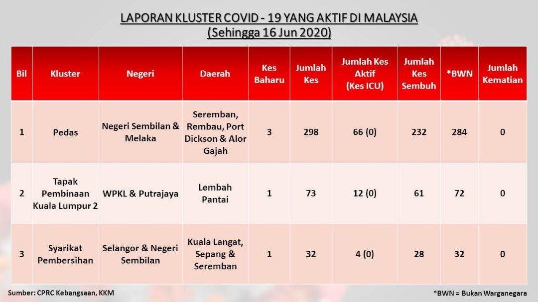 Laporan Kluster COVID-19 Aktif Di Malaysia 16/06/2020 Asrul Siaran Media 16 June 2020 Hits: 856 Rating: ( 0 Rating ) Please Rate Vote 1 Vote 2 Vote 3 Vote 4 Vote 5 Facebook Twitter Prev Next