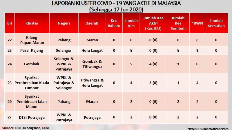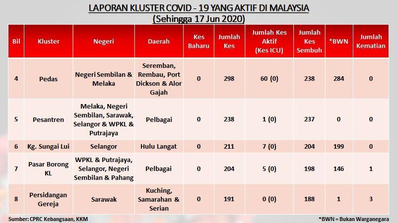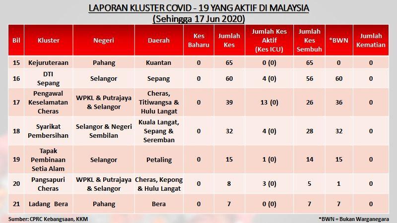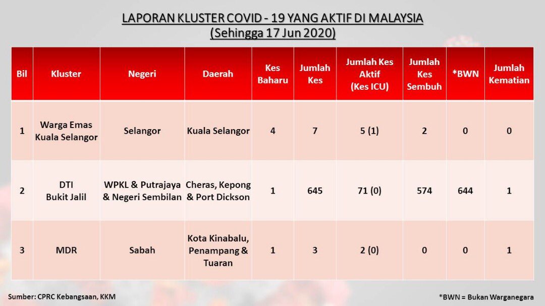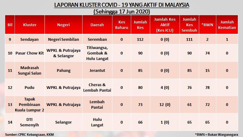 Laporan Kluster COVID-19 Aktif Di Malaysia 17/06/2020 Asrul Siaran Media 17 June 2020 Hits: 940 Rating: ( 0 Rating ) Please Rate Vote 1 Vote 2 Vote 3 Vote 4 Vote 5 Facebook Twitter Prev Next