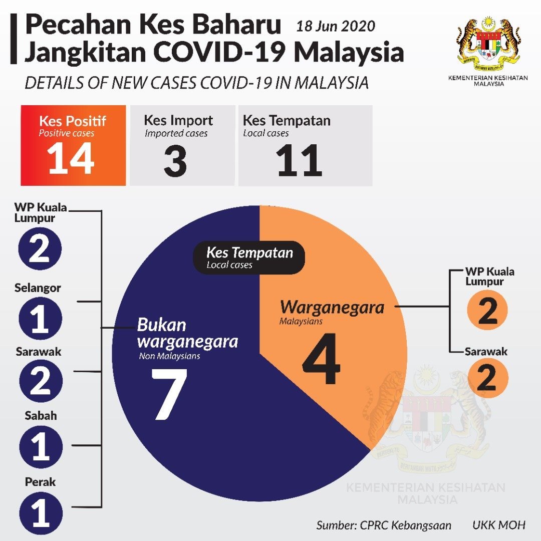 Statistik Pecahan Kes Baharu Jangkitan COVID-19 Malaysia 18/06/2020 Aiman Siaran Media 18 June 2020 Hits: 973 Rating: ( 0 Rating ) Please Rate Vote 1 Vote 2 Vote 3 Vote 4 Vote 5 Lihat / Muat Turun JPG Facebook Twitter Prev Next