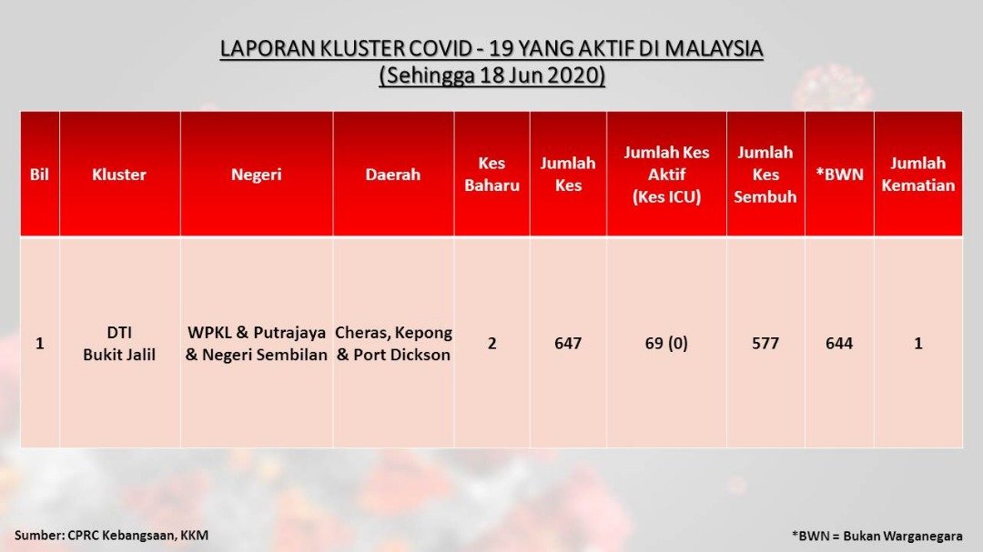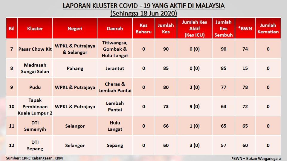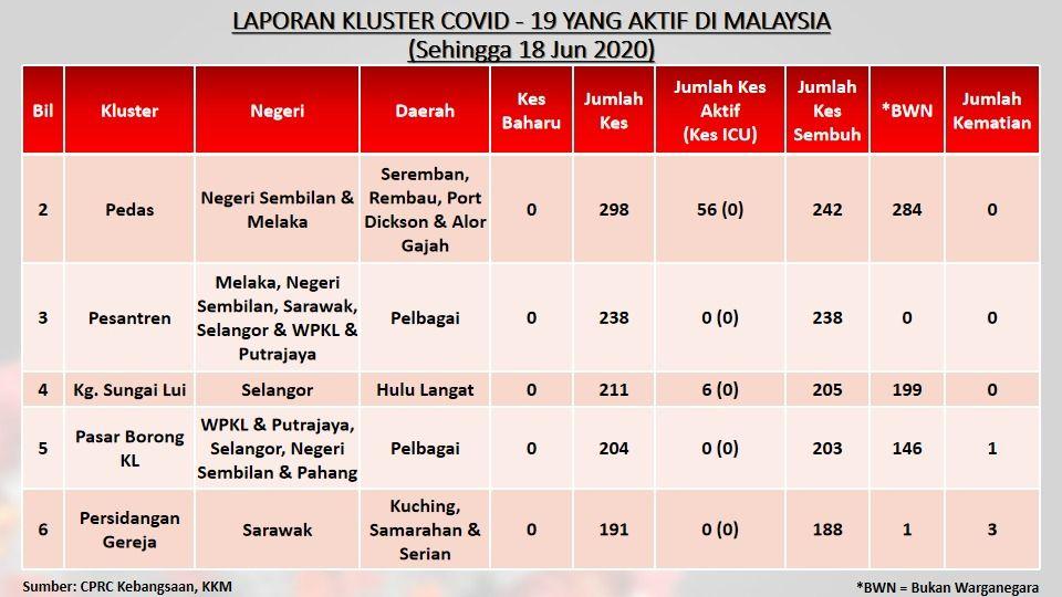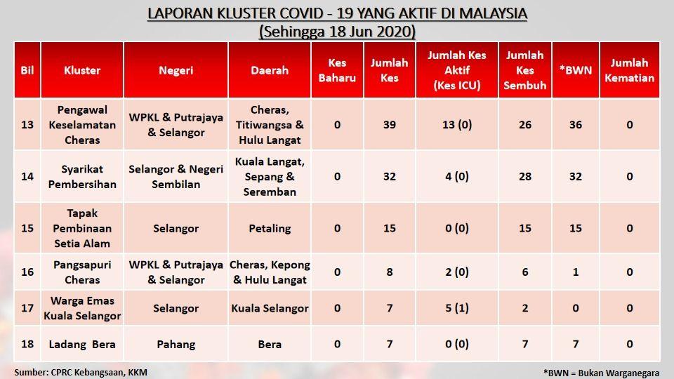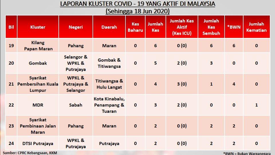 Laporan Kluster COVID-19 Aktif Di Malaysia 18/06/2020 Aiman Siaran Media 18 June 2020 Hits: 851 Rating: ( 0 Rating ) Please Rate Vote 1 Vote 2 Vote 3 Vote 4 Vote 5 Facebook Twitter Prev Next