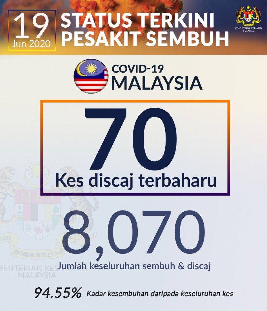 COVID-19 - Jumlah Keseluruhan Kes Discaj 19/06/2020 Asrul Siaran Media 19 June 2020 Hits: 708 Rating: ( 0 Rating ) Please Rate Vote 1 Vote 2 Vote 3 Vote 4 Vote 5 Facebook Twitter Prev Next