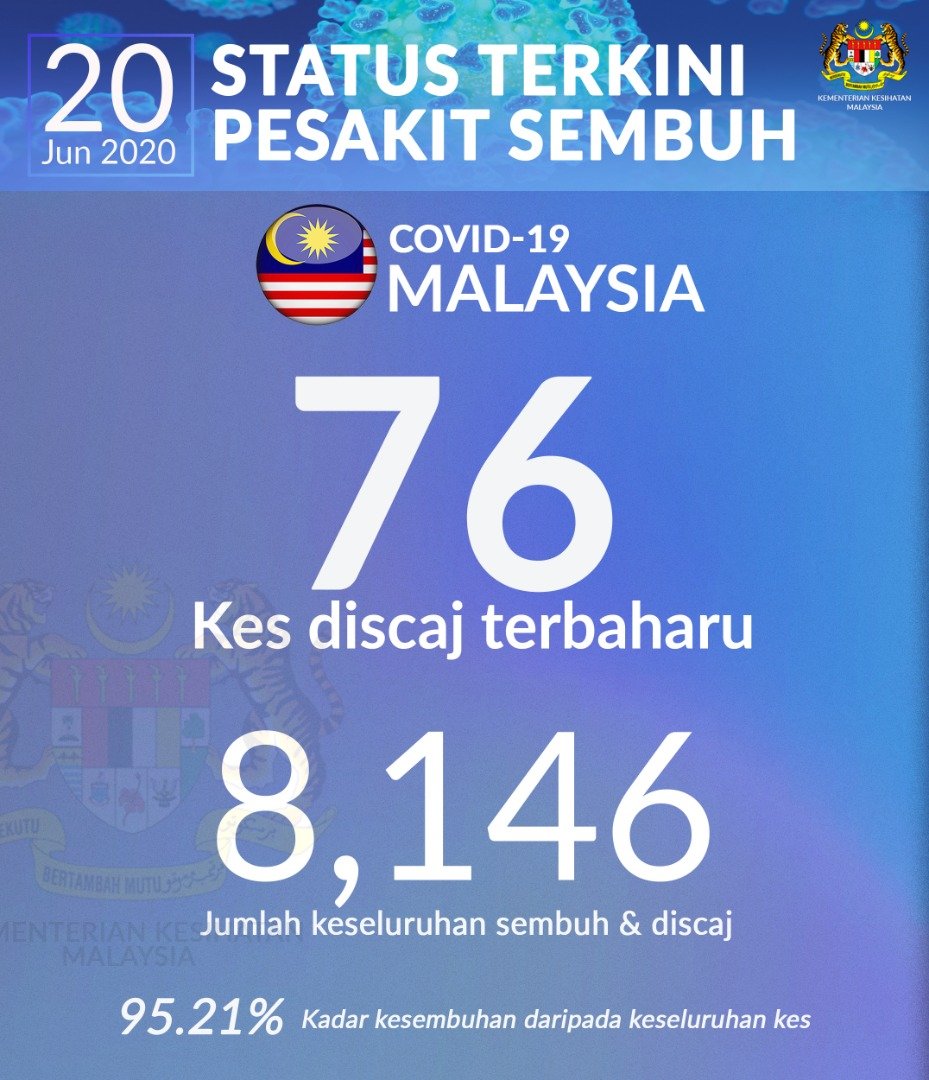 COVID-19 - Jumlah Keseluruhan Kes Discaj 20/06/2020 Asrul Siaran Media 20 June 2020 Hits: 911 Rating: ( 0 Rating ) Please Rate Vote 1 Vote 2 Vote 3 Vote 4 Vote 5 Facebook Twitter Prev Next