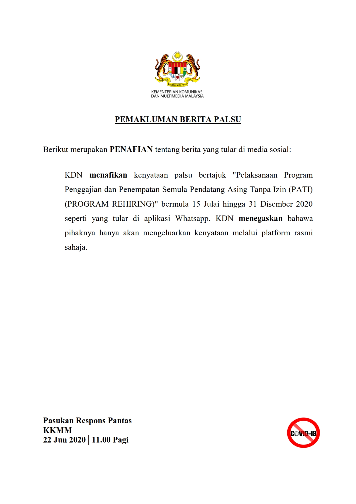 Pemakluman Berita Palsu SKMM 22/06/2020 1100 AM Aiman Siaran Media 22 June 2020 Hits: 858 Rating: ( 0 Rating ) Please Rate Vote 1 Vote 2 Vote 3 Vote 4 Vote 5 Lihat / Muat Turun PDF Facebook Twitter Prev Next