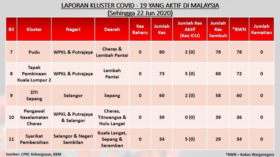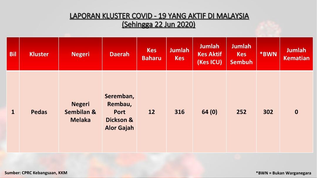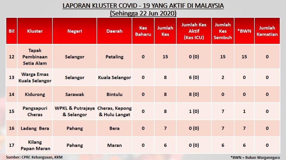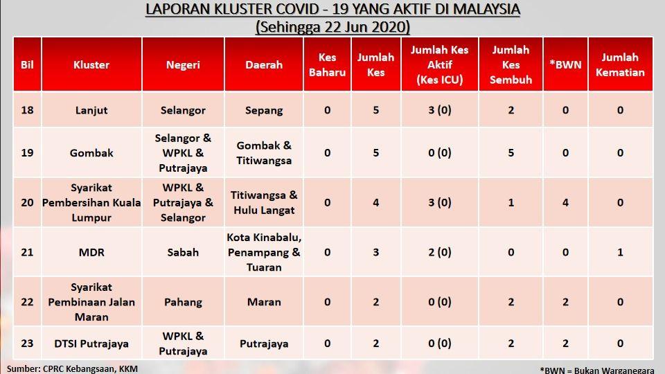 Laporan Kluster COVID-19 Aktif Di Malaysia 22/06/2020 Asrul Siaran Media 22 June 2020 Hits: 753 Rating: ( 0 Rating ) Please Rate Vote 1 Vote 2 Vote 3 Vote 4 Vote 5 Facebook Twitter Prev Next